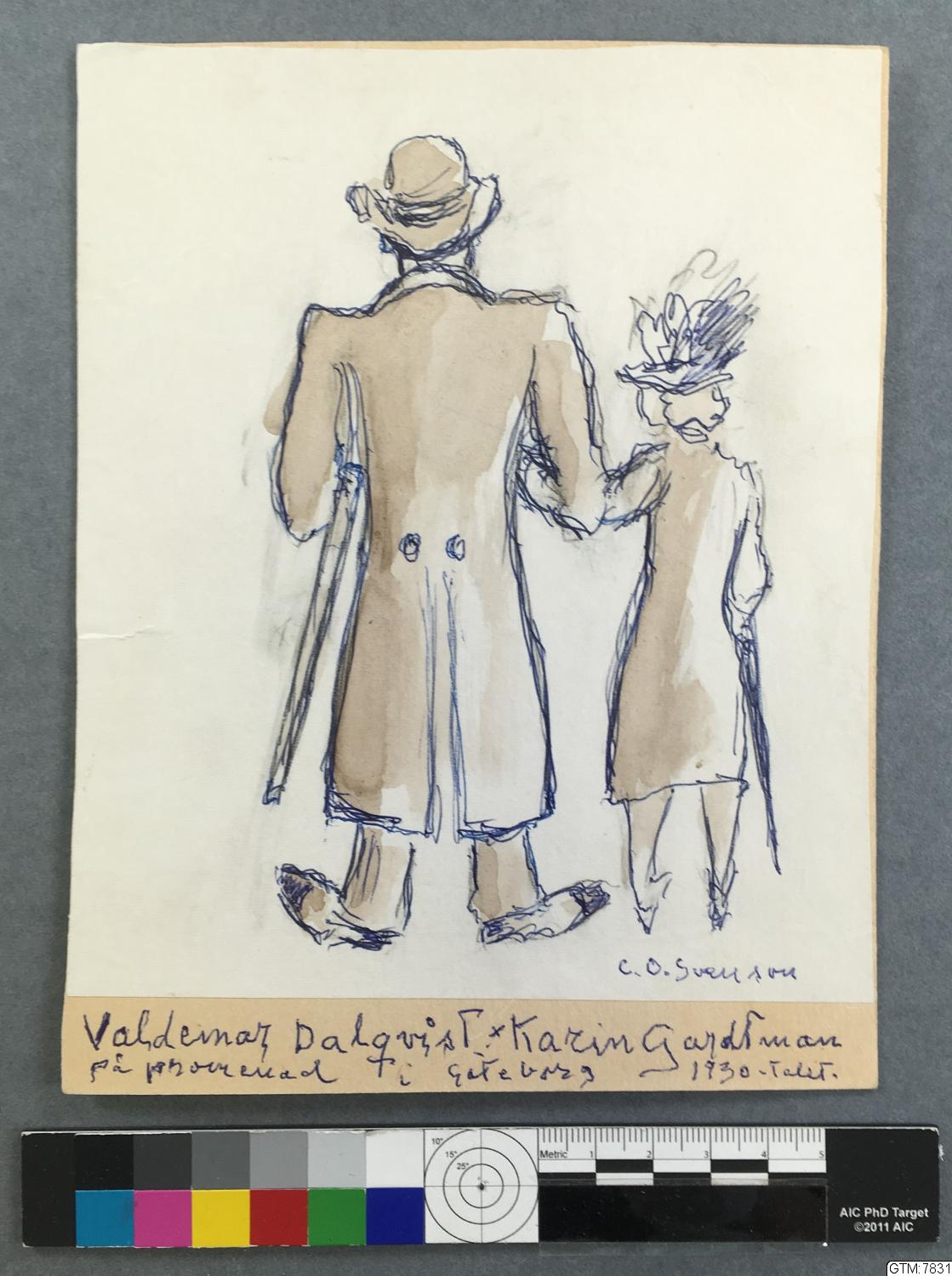 • Teckning föreställer Valdemar Dalquist och Karin Gardtman med komment på baksidan.