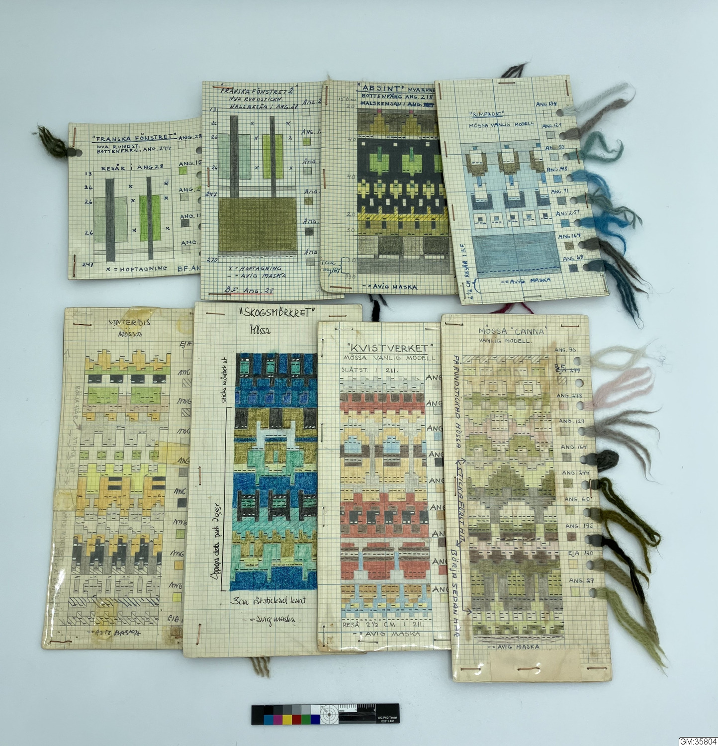 • 8 stycken arbetsritningar till stickmönster för mössa komponerade av Annika Malmström-Bladini för Bohus Stickning.