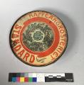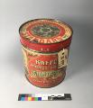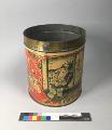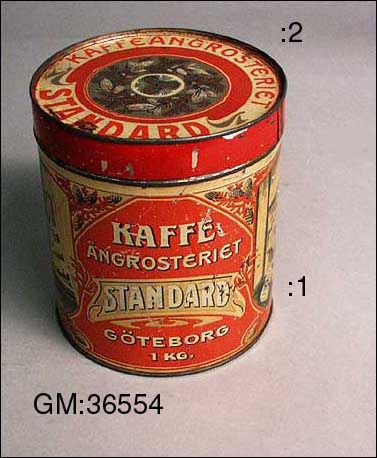 Cylindrisk. Dekor i guld samt gula och grågröna toner; dels två likadana bilder med en tomte som kastar in kaffepaketet genom ett fönster, dels (på det röda fältet) trearmade ljusstakar och stjärnor i guld. Text: "Kaffe ångrosteriet Standard Göteborg 1 kg" Som utfyllnad i alla hörn grankvistar med kottar. -på locket i mitten grankvistar med kottar, däromkring texten "Kafferosteriet Standard"