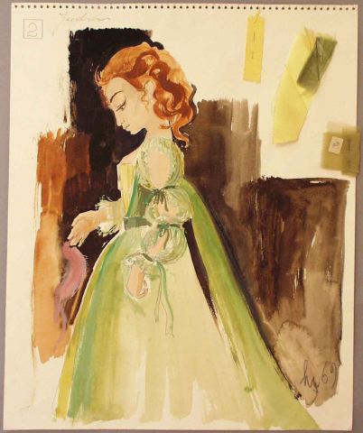 Kvinna stående i profil och har rödbrunt hår uppsatt i bak med hängande lockar, är iklädd ljusgrön överklänning med uppslitsade ärmar med rysch och omtag samt öppning på kjolen framtill, högt placerad midja, gul isättning på det dekolleterade livet och gul underkjol, ljusgrönt släp fäst fäst vid ryggen. Mörkbrun bakgrund. Tygprover fästa med knappnålar överst till höger.