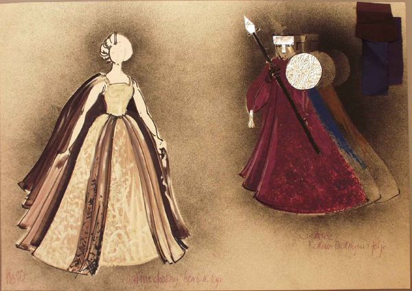 • Två figurer stående mot gråsvart bakgrund. Kvinnan t v har uppsatt hår eller huvudbonad, är iklädd beigemönstrad hellång klänning med åtsittande liv, dekolletage och utan ärmar, överkjol med lilabruna mönstrade kantband, brunlila mantel fäst vid axlarna. Kvinnan t h har en silverfärgad hjälmliknande huvudbonad med ett nässkydd och är iklädd lilafärgad hellång vid kåpa, hon håller ett silversvärd ... Visa hela
