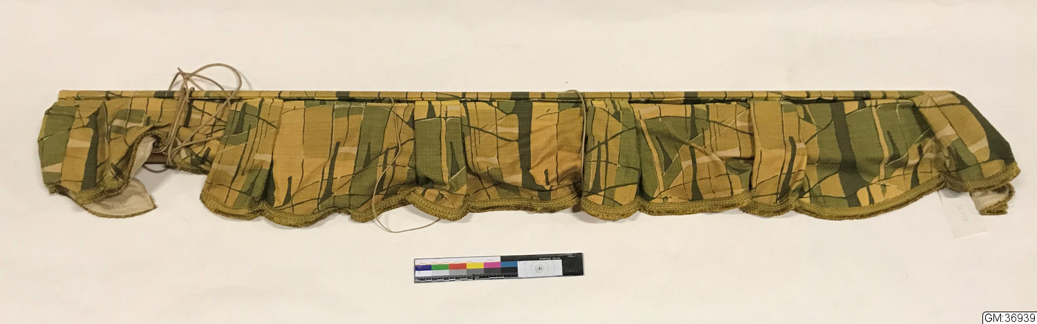 Rektangulära gardiner av konstfibermaterial, vistra, med vit botten och tryckt mönster med stora blad i gult och grått. Bladen är streckade med gult på grått och grått på gult, samt kornisch av trä.