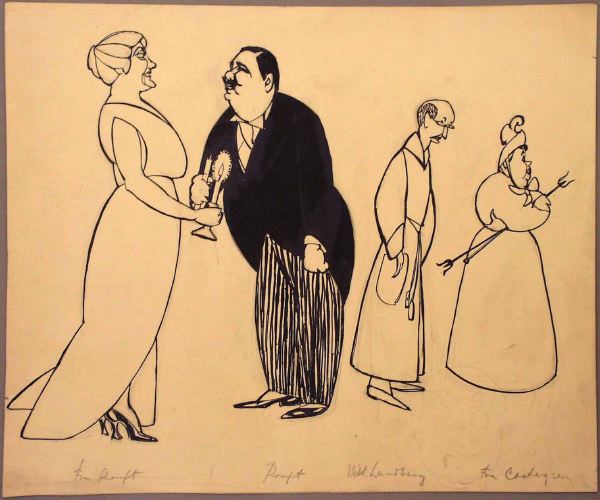 Teckningen utgörs av fyra personer med resp. namn angivet. Från vänster Fru Ranft: stående i profil iklädd ärmlös klänning med V-ringning och kjol med släp och slits framtill, bär högklackade skor, håller ett brinnande ljus i en handen. Ranft: korpulent man med mustasch som bugar sig mot Fru Ranft, iklädd jackett med randiga byxor, skor med vita damasker. Vikt. Lundberg: magerlagd man med kal hjäs...