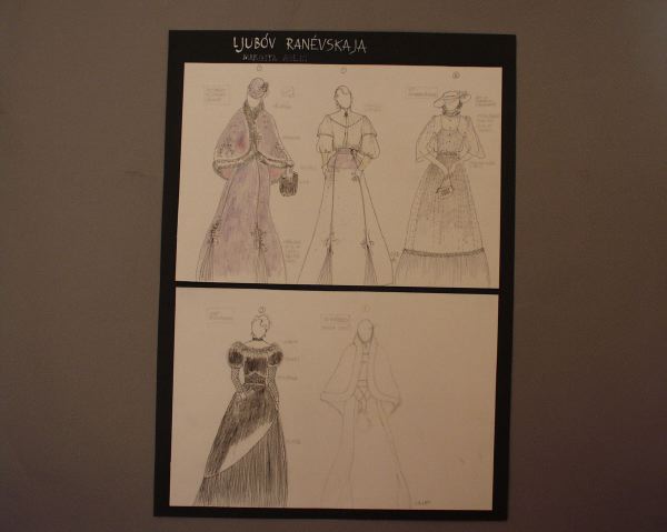 LJUBÓV RANÉVSKAJA. MARGITA AHLIN. (med vit skrift på det svarta pappret.) På översta skissen. 1: RESDRÄKT PLOMMONF. SAMMET. PÄLSBRÄM, BRODERIER, HANDSKAR, MUFF, INFÄLLDA VECK AV SIDEN I KJOLENS FÄRG. + 1: TUNN BLUS ELFENBEN. 2: VIT SOMMARKLÄNNING. LÄTT VIT SOMMARHATT M. BLOMMOR PÅ. YTTERKLÄNNING I TUNN VOILE ÖVER VIT UNDERKL. BRODERAT SKÄRP O VÄSKA. Undre arket 3: SVART BALKLÄNNING, SVANDUN, SAMMET, SPETSÄRM, PLISSÉ. 4: VID AVFÄRDEN. SAMMA SOM 1.