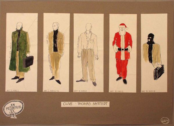 Fem kostymskisser utförda på vita ark är upplimmade på ljusgrått papper, där alla skisserna är angivna med akt- och scennummer. Från vänster: AKT l scen 1: Iklädd svart polotröja, beige byxor, olivgrön trenchcoat, svarta skor, bär på en svart dokumentportfölj. AKT 1 scen 1 + 2: Svart polotröja, ljusbeige kavaj och byxor, svarta skor. AKT 1 scen 3: uppknäppt vit skjorta, ljusa gråbeige byxor med uppslag, grå strumpor (i strumplästen). AKT ll scen 1: utklädd till jultomte med tomteskägg m m. AKT ll scen 2: svart rånarhuva och polotröja, beige kostym, bär dokumentportfölj. (OBS! för ytterligare beskr. se under påskrift)