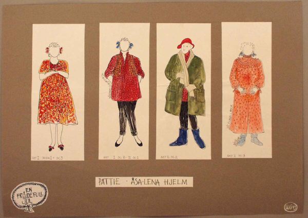 Fyra kostymskisser utförda på vita ark och upplimmade på ljusgrått papper, alla med resp. akt och scenbild angivna. Från vänster AKT l sc 3: hon har krusigt hår med rödmönstrad rosett på var sida, iklädd röd-gul-och grönmönstrad knäkort klänning med korta ärmar och vid kjol, stor röd rosett vid halslinningen, grå skor med röd rosett. AKT l sc 2 - ll sc 1: har blå rosetter i håret, iklädd rödmönstrad utanpåskjorta med uppkavlade ärmar, kort uppknäpp gul-och rödmönstrad väst, grårandiga byxor med uppslag, svarta skor. AKT l sc.2: iklädd röd hatt, rödmönstrade skjortan under en 7/8delslång grön kappa med utanpåfickor, samma byxor, blå korta stövlar, benvit halsduk med fransar och handskar. AKT l sc.3: rosamönstrad morgonrock med rysch vid hals, ok och ärmar, ljusblå sockor. (Obs! se ytterligare beskr. under påskrift)