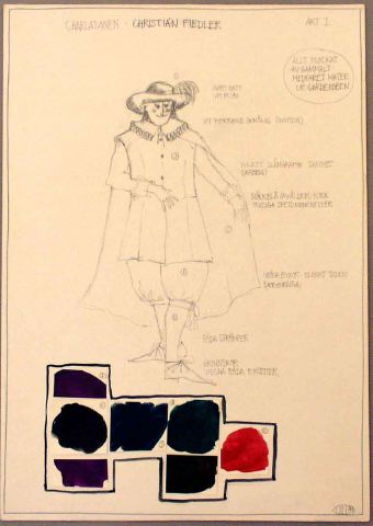 CHARLATANEN . CHRISTIAN FIEDLER. AKT l. (Allt plockat av gammalt medfaret mater. ur garderoben.) Svart hatt vit plym, vit pipkrage (knölig, smutsig) Violett slängkappa sammet (skabbig) Mörkblå (av ålder) rock trasiga spetsmanschetter. Gröna byxor blankt siden (skrynkliga) Röda strömper, skonnskor vissna röda rosetter.