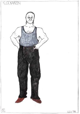 Man med stripigt hår, iklädd blågrå-randig ärmlös undertröja, svarta byxor med två röda knappar på var sida, rödbruna skor.