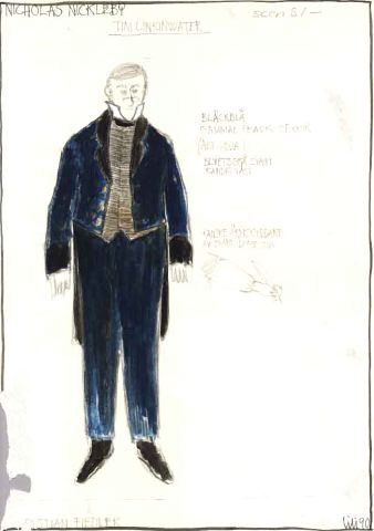 NICHOLAS NICKLEBY, TIM LINKINWATER, scen 51, CHRISTIAN FIEDLER. Bläckblå gammal frack o byxor (alt. udda) blyertsgrå svagt randig väst. Kanske ärmskyddare av svart domestik.