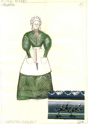 Kvinna iklädd vit hätta med rosamönstrad spets och hakband, randig grön lång klänning med höghalsat liv, puffärmar med smal manschett, vitt midjeförkläde, sax hängande i rött snöre från midjan. T h i nerkanten fastlimmat tygprov.
