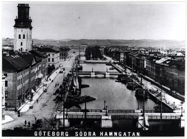 Södra Hamngatan 27/6 1885. Stora Hamnkanalen mot öster från Lilla Torget.Foto av foto ur album.