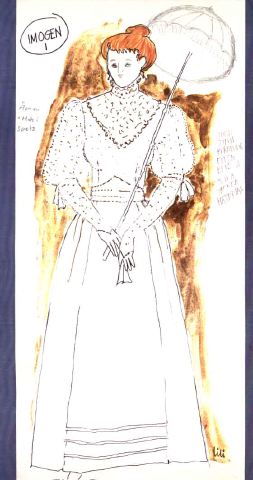 Kvinna med rött uppsatt hår iklädd vit klänning med spetsisättning och hög krage med krås i det åtsittande livet, blusande ärm till armbågen med rosett vid linningen, långa spetsvantar, lång kjol. Hon har ett parasoll.
