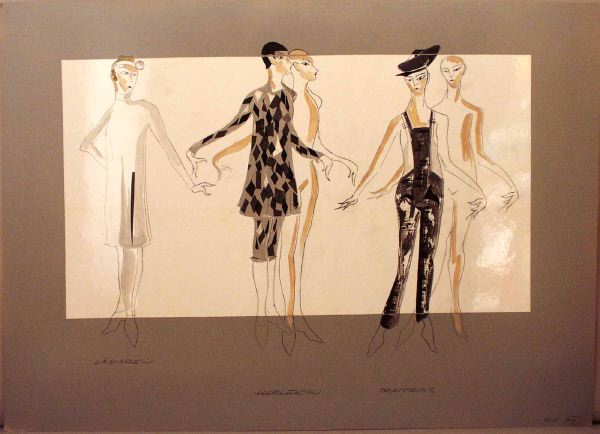 Skissen utförd på vit plastfilm monterad på ljusgrå kartong. Teckningar går ibland över på kartongen, är gjorda med spritpenna och isättningar med acrylfärg. Till vänster en figur iklädd läkarrock, och smala byxor. I mitten en figur med kortklippt svart hår, iklädd grårutig tunika med smala långa ärmar och knäbyxor. Bakom till höger samma figur helt naken. På skissens högra sida en figur med svart hatt, gråsvarta overollsbyxor med bröstlapp. Snett bakom samma figur helt naken. (Skissens plastade yta gav tyvärr reflex vid bildåtergivningen)