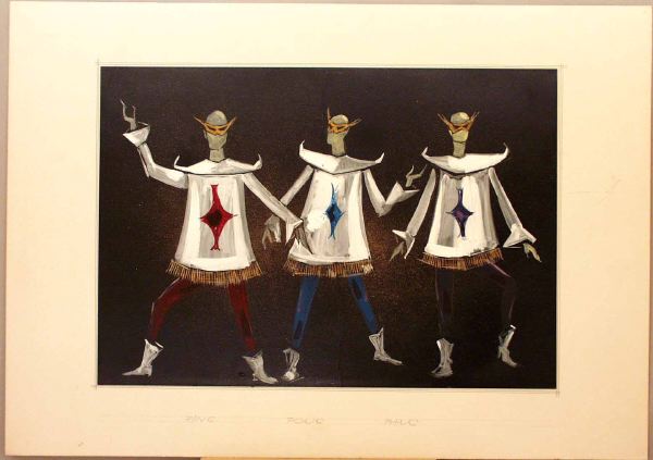 Skissen utförd på tunn kartong och har en sprutmålad yta i svart med inslag av guld Tre mansfigurer stående i olika rörelser med guldmasker för ögonen, alla iklädda kort vit tunika, halskrage med "vingar", smala långa ärmar med klockad manschett, alla tre har guldfrans nertill på skjortan och ett fyrkantigt mönster mitt på, var och en i sin färg, vinrött, turkosblått och lila med samma färg på sina trikåer samt vita låga stövlar.