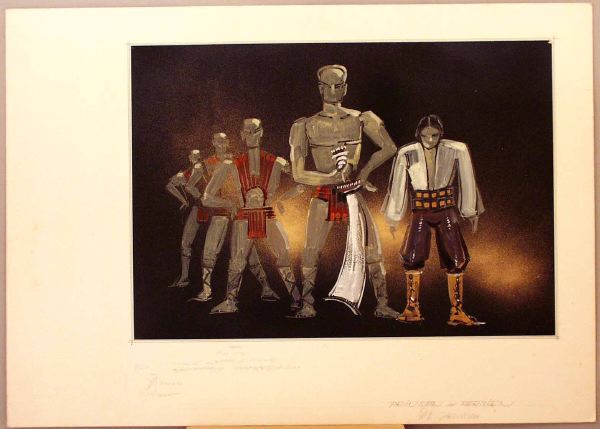 Skissen utförd på tunn kartong som har svart sprutmålad yta med inslag av guld. I mitten står en kraftfull man, naken, endast iklädd intensivt rött brett bälte med litet "förkläde", sandaler med bensnörning, bred silverfärgad sabel fäst vid bältet. Snett bakom honom t v tre stycken figurer i samma kostymering med en röd västliknande överdel men utan sabel. På höger sida av skissen står en man (Prinsen) med mörkt hår och böjt huvud, iklädd vit öppen skjorta med långa blusande ärmar, brett bälte i guld och svart, brunlila knäbyxor, guldstövlar med snörning.