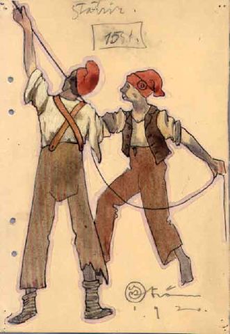 Två mansfigurer drar tillsammans i en lina, den ena med ryggen vänd utåt, den andra i delvis i profil, båda iklädda röd luvor, ljusa skjortot med uppkavalde ärmar, ljusgrön byxor med orage ränder och trasiga i nerkanten, mannen t v har korslagda hängslen och nerhasade randiga strumpor, den t h har en uppknäppt brun väst. Runt figurernas konturer en smal "skuggning", c:a 2 mm, i ljusrosa.