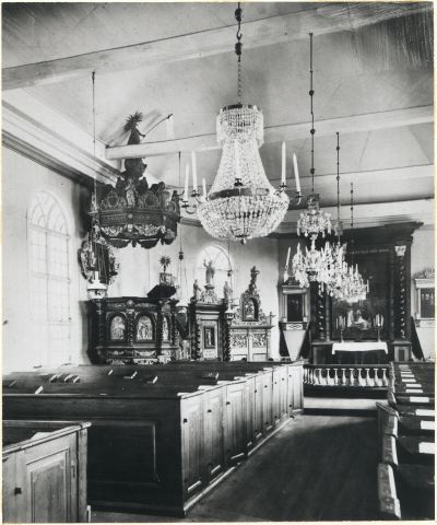 Interiör från Lysekils gamla (trä-) kyrka, med predikstol som tidigare tillhört Kristine kyrka i Göteborg.