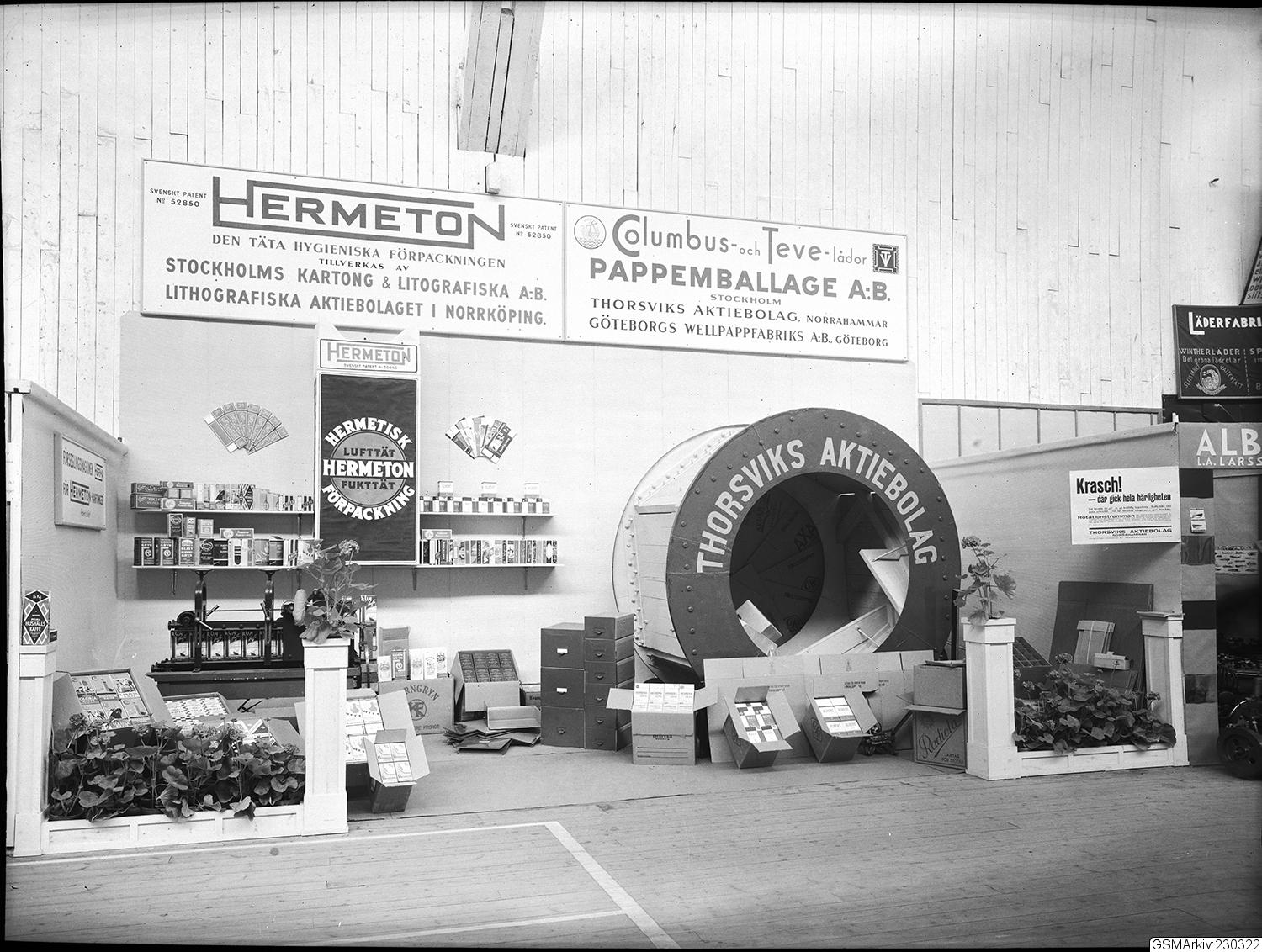 • Monter på Svenska Mässan, utställare Stockholms Kartong & Lithografiska A-B, Lithografiska Aktiebolaget Norrköping, Columbus-och Tevelådor, Pappemballage AB, Thorsviks Aktiebolag, Norrhammar och Göteborgs Wellpappfabriks AB.