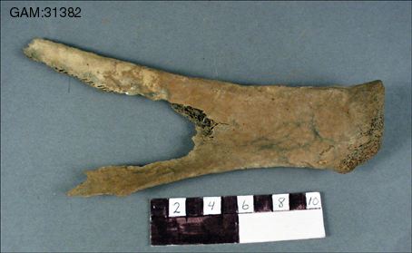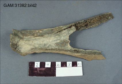 Ben av ko fanns bland benen som man tog upp våren efter att ett skelett hittats vid Rolfsåker i norra Halland. Det rör sig troligen om en boplats. Här fanns också en bäverkäke där man ser att den stör...