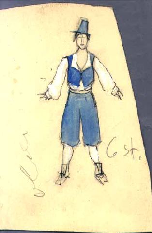 Man iklädd ljusblå strutformad hatt, vit uppknäppt skjorta med utvikt krage, långa blusande ärmar, ljusblå väst och knäbyxor, vita strumpor, skor med spänne.