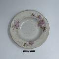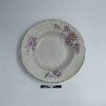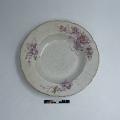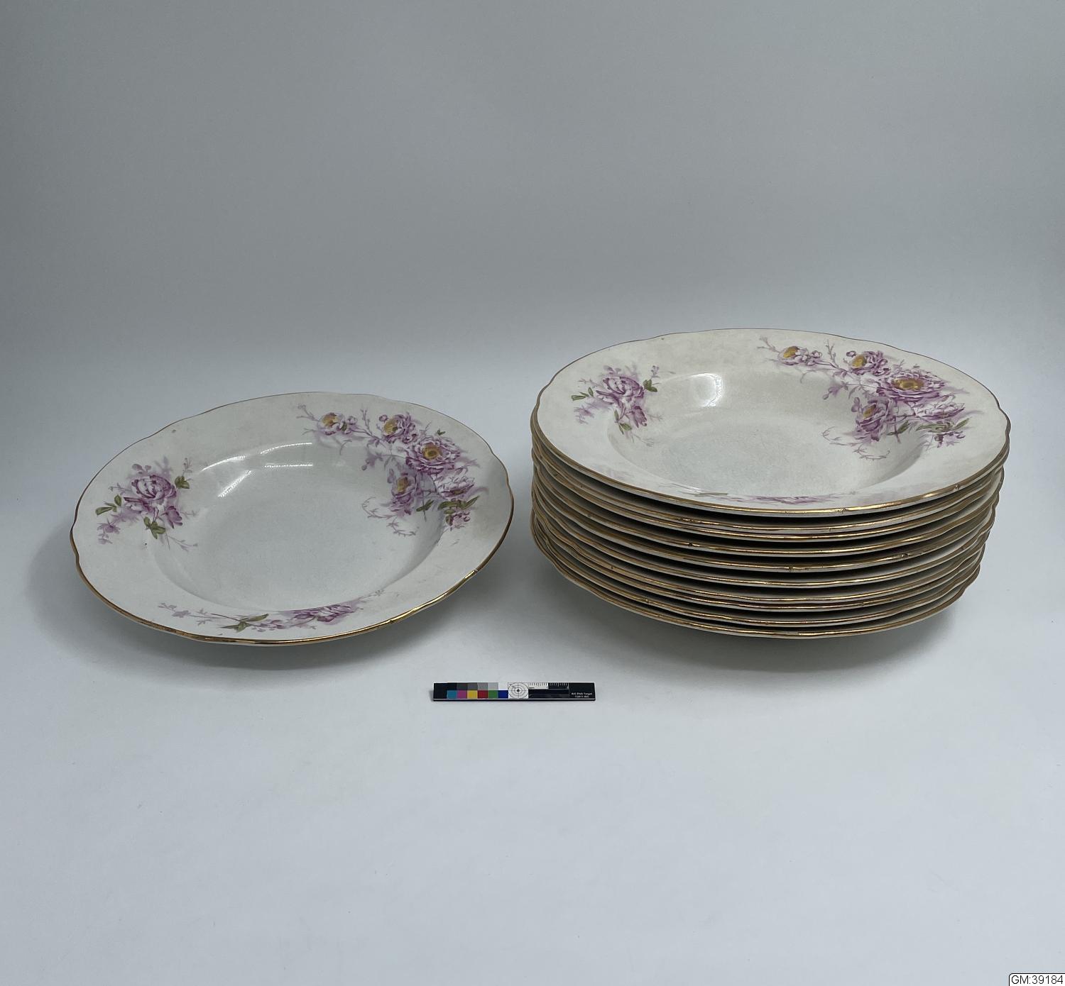 11 st djupa runda mattallrikar av vitt flintgods. Inåtlutande brätte med passig (vågig) guldprofilerad kant. Blomdekor i rött med inslag av grönt och gult som delvis täcker brättet och även fortsätter ner på kep och spegel. Ingår i matservis GM:39176-184, som tillhört givarens föräldrar. Torligen ingköpt av fadern, J.A. Larsson, vars äldsta dotter hette Ingeborg.