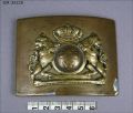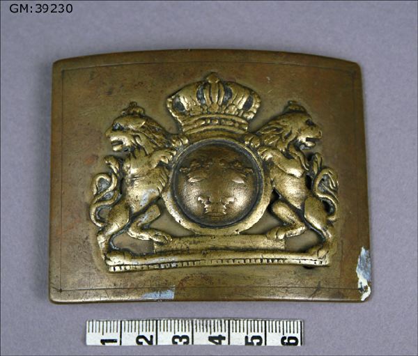 Sotardräktspänne. Gesällspänne med riksvapnet går enl. traditionen tillbaka till drottning Kristinas tid. Spännet beställdes och betalades av den nye gesällen och skilde honom från lärlingen, som i sitt bälte hade ett spänne med två korslagda rafflar (se GM:39231). Skråandan hos sotarmästarna försvann på 1960-talet.