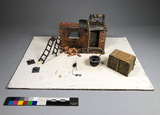 Rödbrun murad fasad med ett hål i väggen där murstenar ligger nedanför hålet, till höger därom en trappavsats framför en halvöppen dörr av trä, taket är platt med en murkant till vänster och ovanför dörren en vevanordning med lina som hänger ner framför fasaden och har en krok ytterst, till vänster framför huset står en trappstege, mitt framför dörren en gråsvart gryta med slev, till höger en trä...