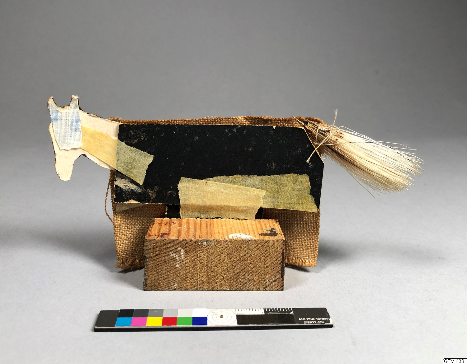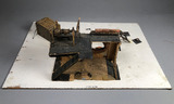 huvuddelena av modellen är gjord av utskuret trä och papper med delar limmade mot varandra och på en tunn kartong utskuren efter husfasaden, den pluss de andra objekten är limmade på en vitmålad plywoodskiva.