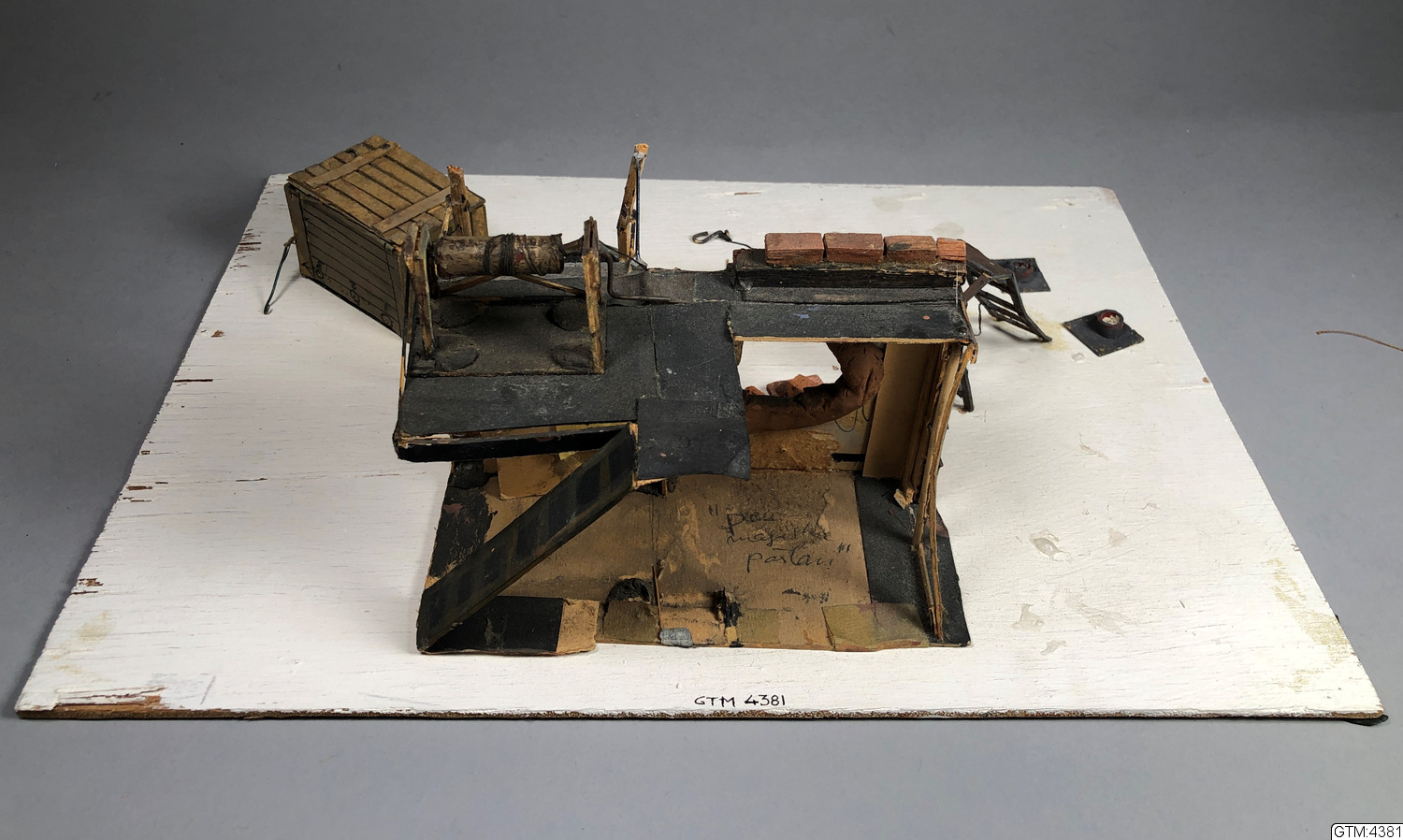 huvuddelena av modellen är gjord av utskuret trä och papper med delar limmade mot varandra och på en tunn kartong utskuren efter husfasaden, den pluss de andra objekten är limmade på en vitmålad plywo...