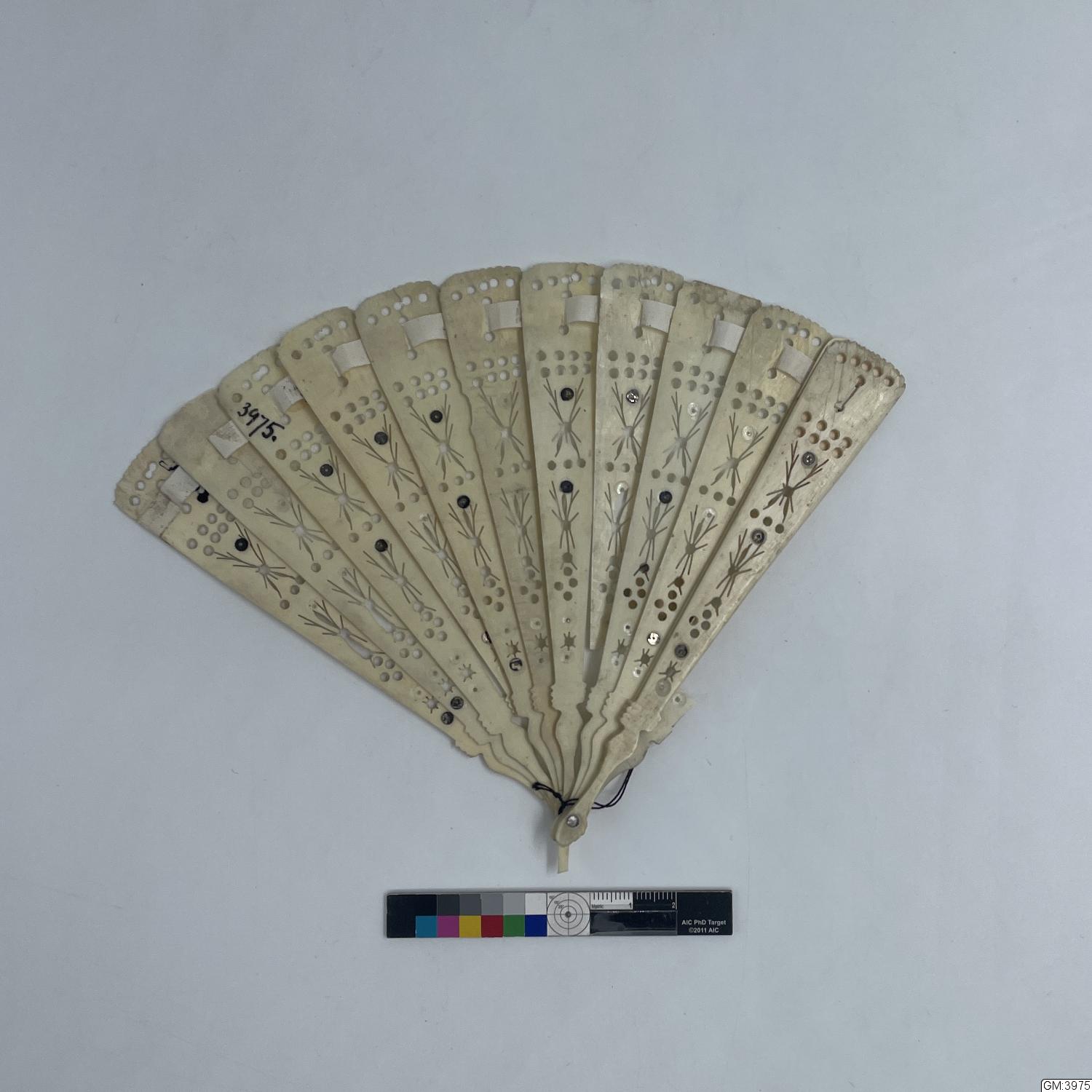 • Liten solfjäder i snidad elfenben med metallpaljetter.