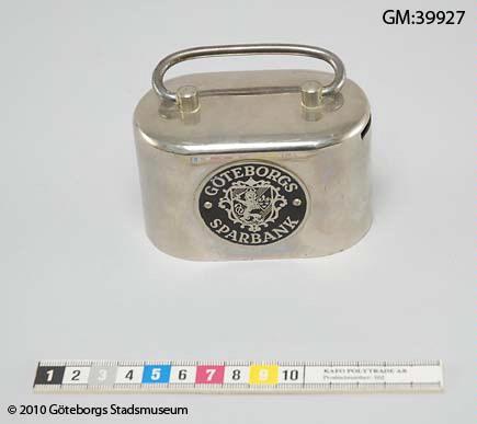 Sparbössa i vit metall dekorerad på fronten med ett märke av Göteborgs stadsvapen i svart och silver och med texten"Göteborgs sparbank". Sparbössan är oval till formen med ett vinkelbart handtag på ovansidan. Skåra för mynt inkast på båda sidor; 3,5cm brett på ena sidan och 1,5cm brett på den andra. Sparbössan kan öppnas med nycket på undersidan. Stämplad på undersidan med "25443" och "NORDIA-DUPLEX". Höjd:6cm (höjd med handtaget uppfällt: ca 8cm.