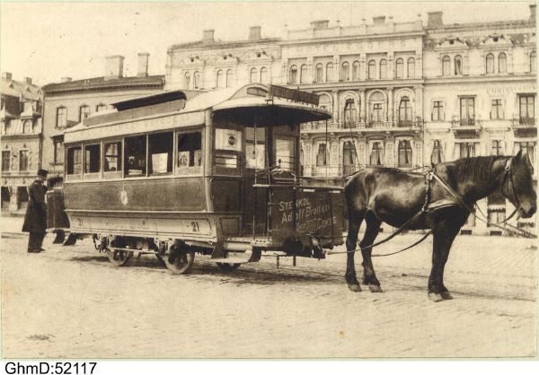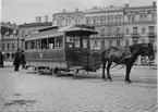 • Hästspårvagn på Drottningtorget, 1901. I Göteborg började elektriska spårvagnar gå 1902.