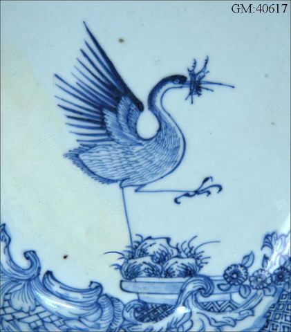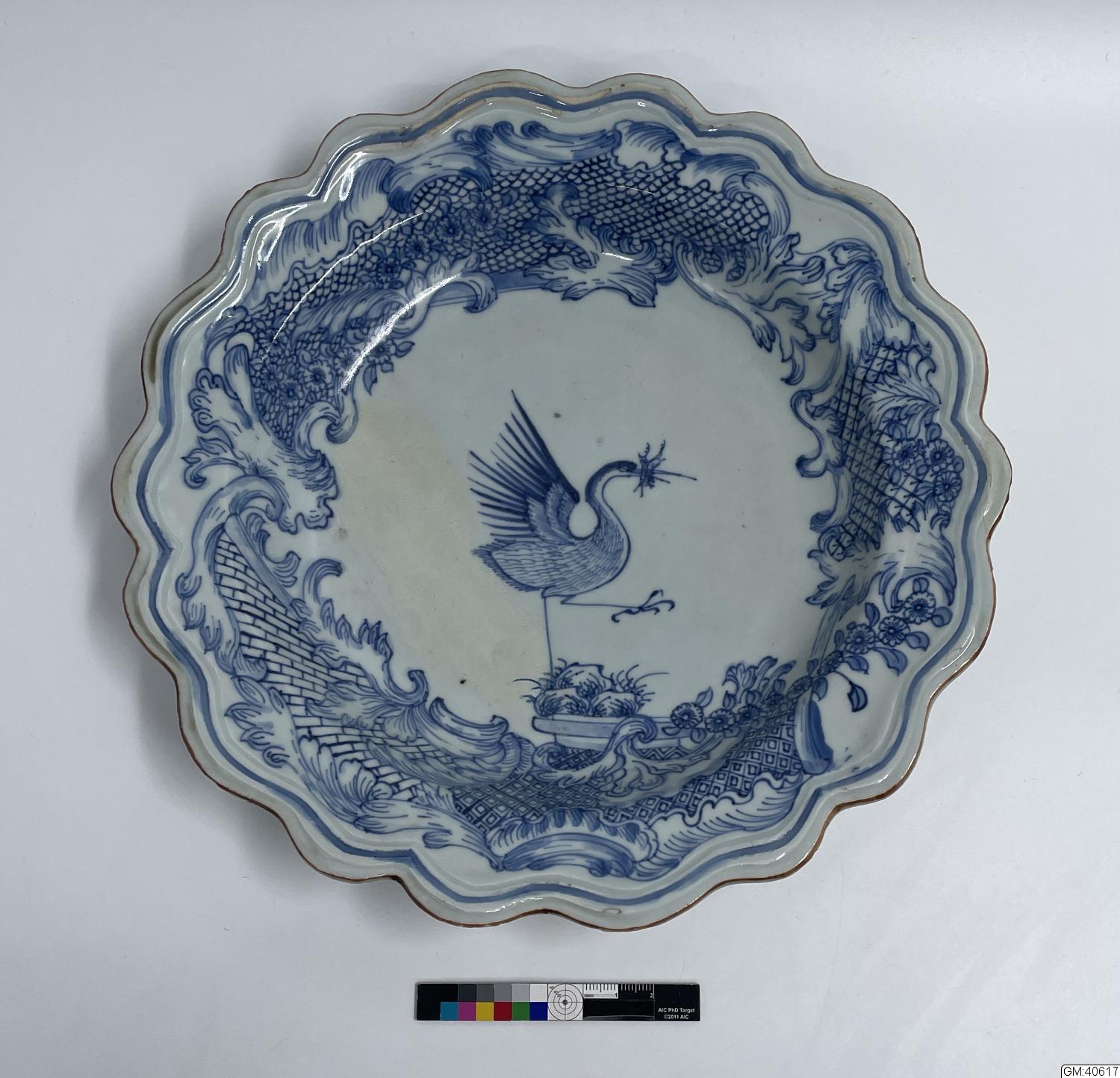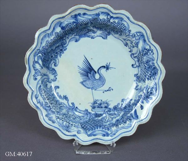 Smalt brätte med vågig kontur som upprepas i två relieflinjer. Tjockt ljusblått porslin med blå underglasyrmålning: bred rokokobård på brätte och kep med blommor och blad samt olika turmönster. På bården står en trana, hämtad från familjen Grills vapen, vilken bildar mittornament. Brun kant på brättet.