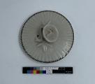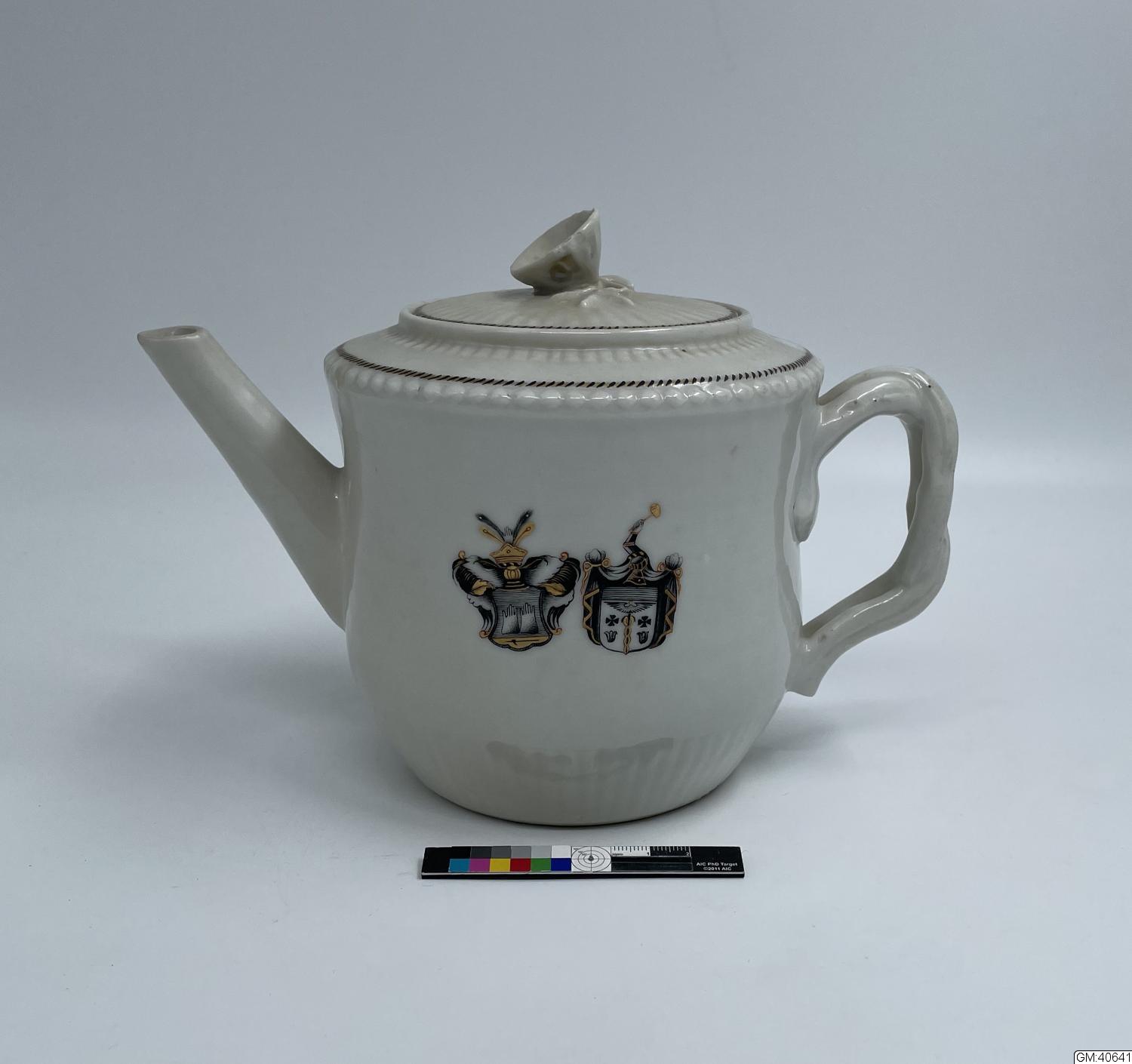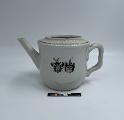 • Tekanna i gråvitt gods med överglasyrmålning i sepia och guld. Lätt bukig, urnform med plan skuldra och dito lock, rak pip och lodgrepe av dubbla korsslagna länkar. Partiet nedanför grepen refflat, likaså ett smalt parti vid mynningskanten; skuldran pryds av pärlstav. Locket refflat och med lockknopp av blomma. Den målade dekoren utgörs, förutom av en tunn bård på lock och skuldra, av alliansvapen... Visa hela