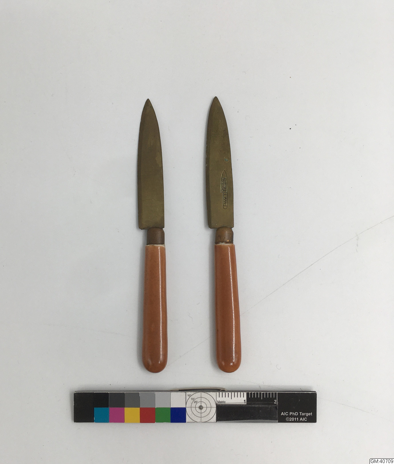 • 2 matknivar med blad av mässing märkt "Austria"; brunglaserade skaft av keramiskt material.