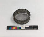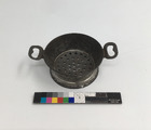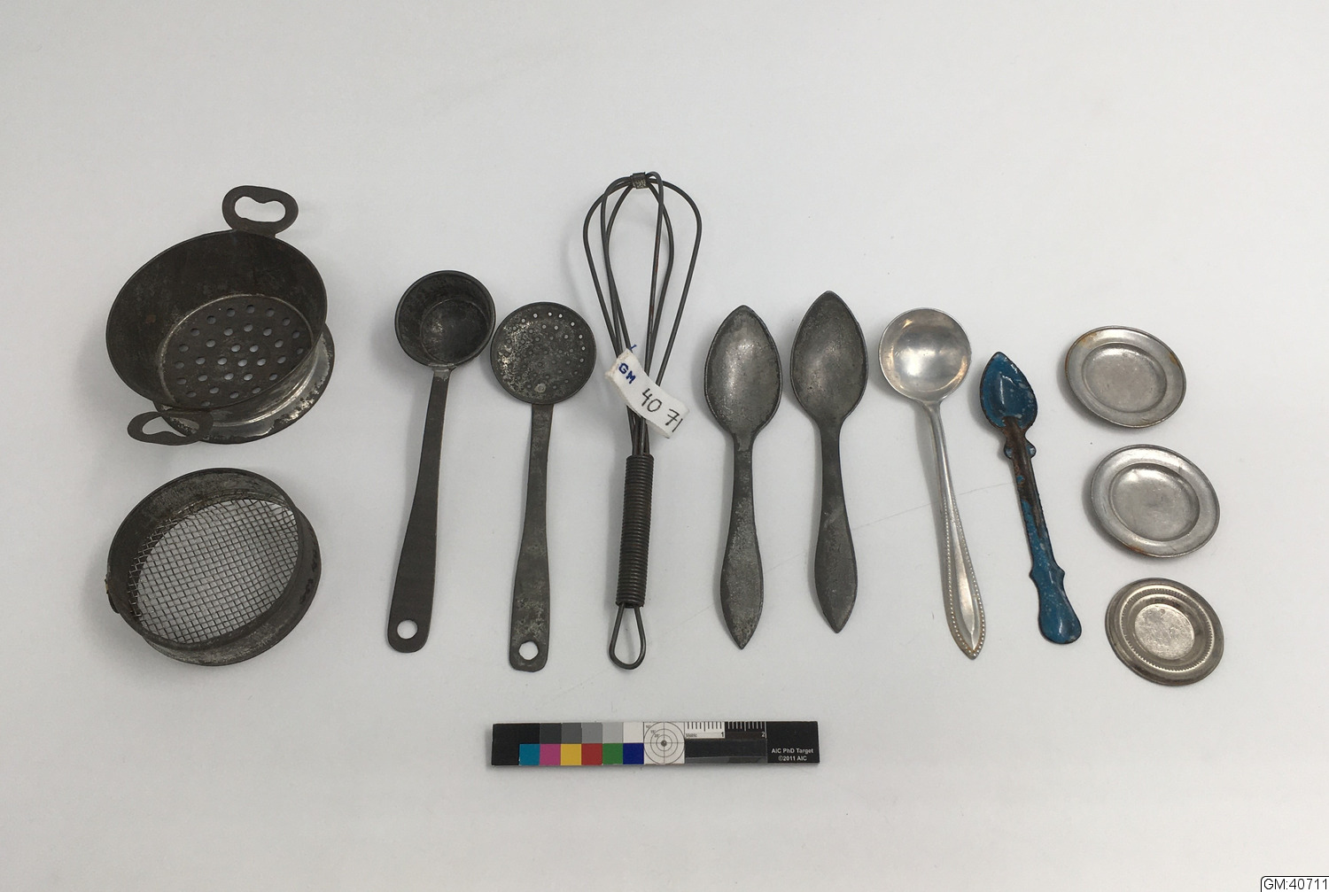 Dockhusgeråd, 12 stycken 1) durkslag 2) sikt 3) soppslev 4) hålslev 5) ballongvisp 6-7) förläggsslevar 8) soppslev 9) sked av emaljerad plåt 10-11) tallrikar, av vitmetall "Germany" 12) tallrik, förnicklad plåt