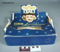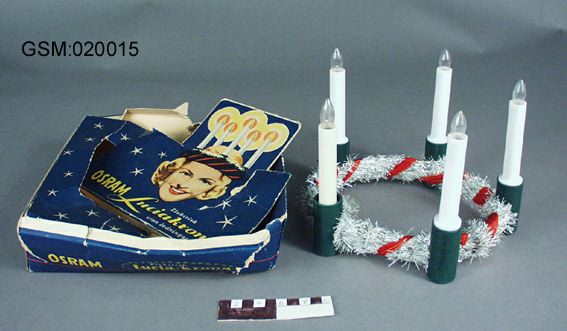 Luciakrona för elektriskt ljus med batteridrift. Batterierna berövas sitt omslag och ljuskontakterna ansluts via metalltungor som sticks ned mellan ljushållaren i plast och batteriets sida. När "lågan"/lampan skruvas i sluts kretsen och lampan tänds. Patent nr 162436 Originalkartong med anvisningar för montering av krona och batterier.