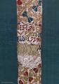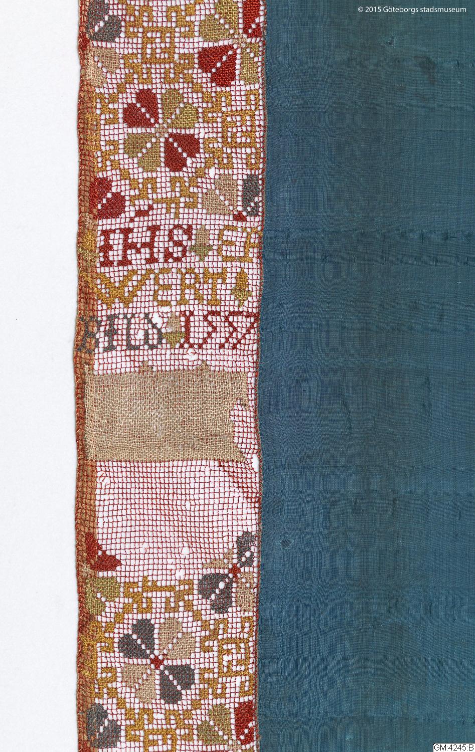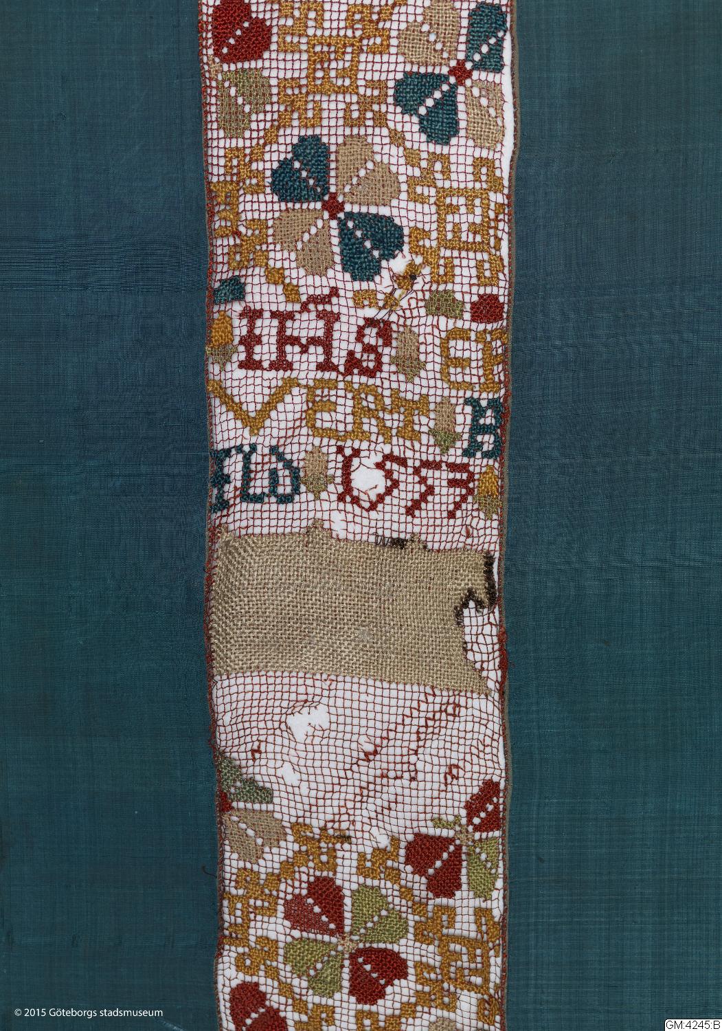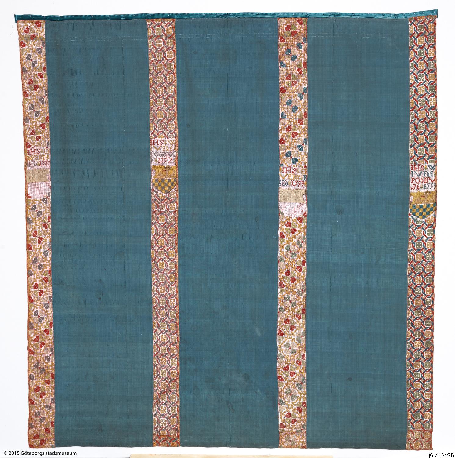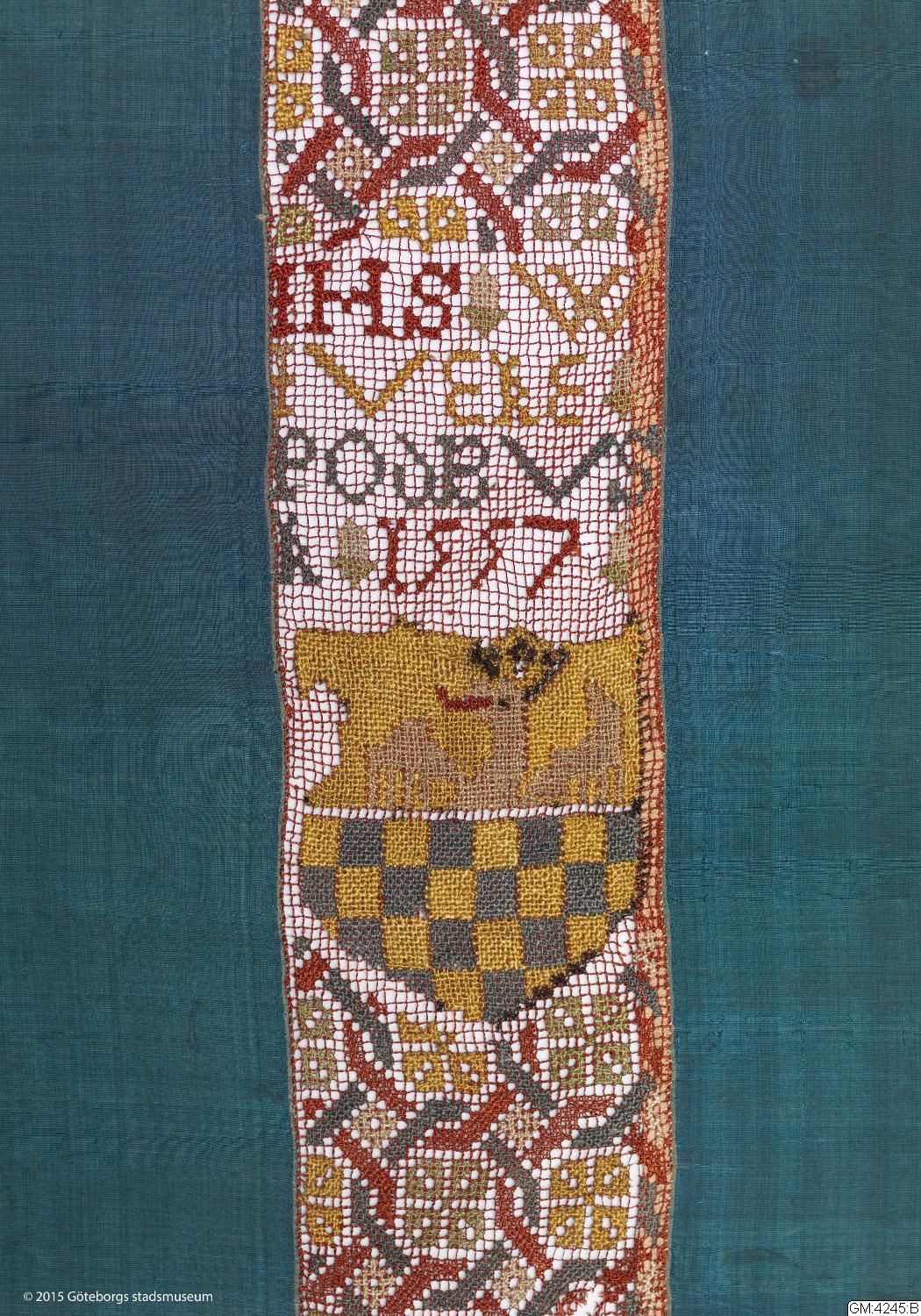 Tre våder blått siden; mellan våderna och längsmed sidornas ytterkant är filetknutna nät av rött silke infogade. Dessa nät är prydda med polykroma trädsömsbroderier; broderat på detta vis är årtalen 1553, 1557 ett mansnamn och ett kvinnonamn två olika vapensköldar som upprepas samt olika mönster som dagonala gallermönster och stiliserade blommor. Att brodera med trädsöm på en fiketnätsbotten var p...