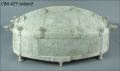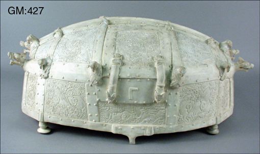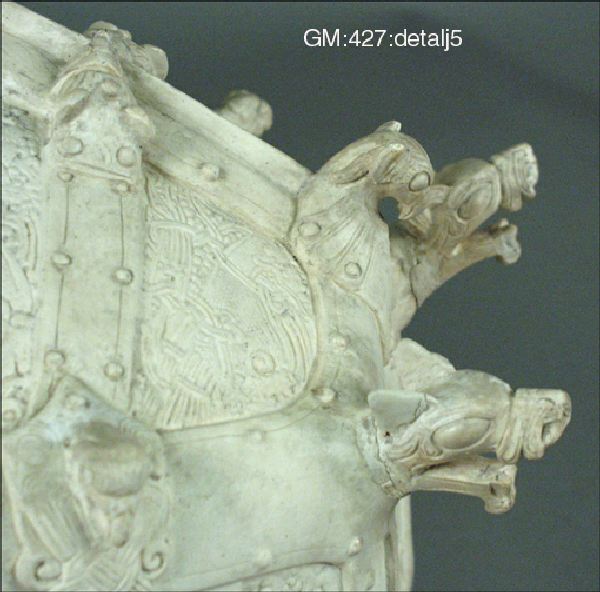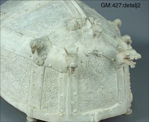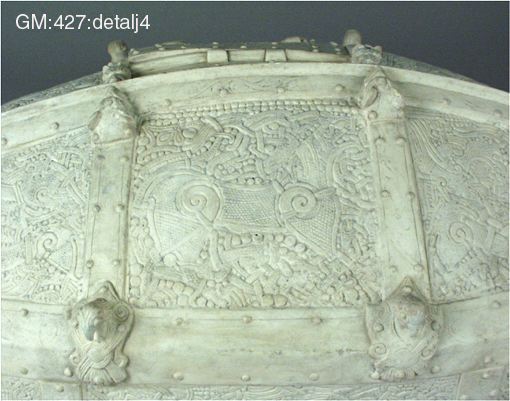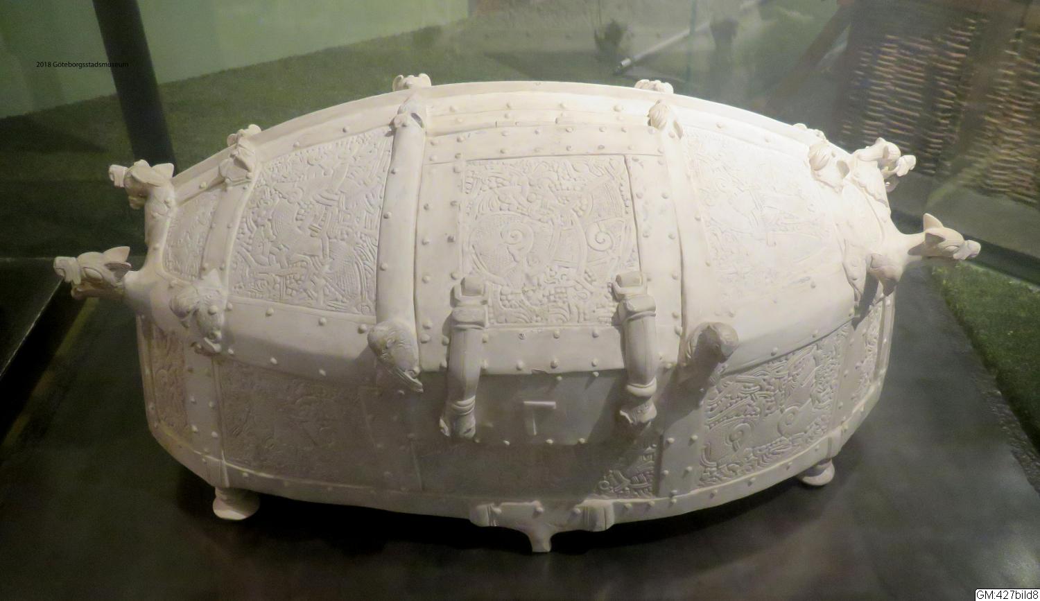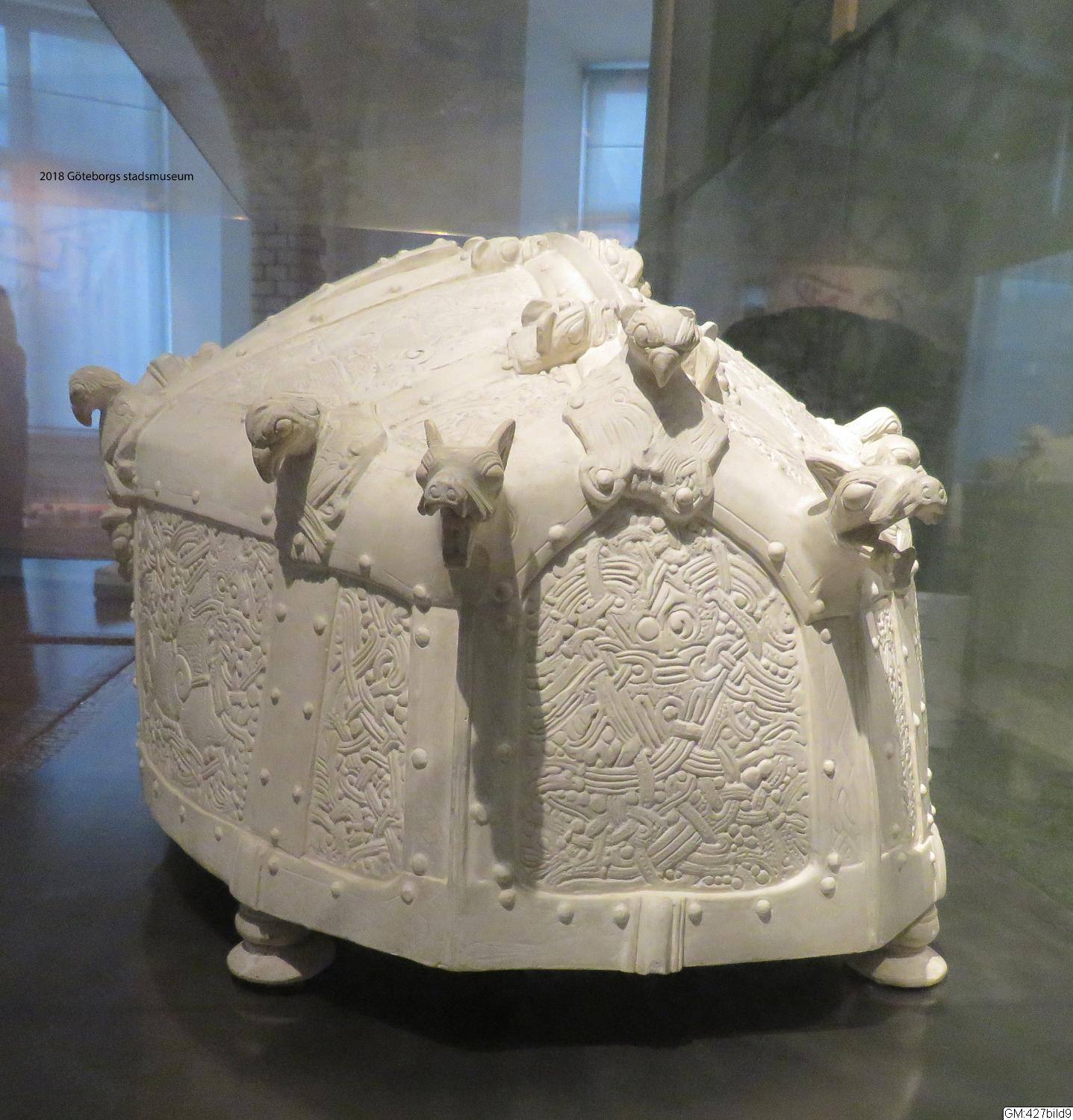 Kammnskrinet Kamminskrinet är en modell av en hövdingahall. Skrinet tillverkades för ungefär 1000 år sedan. Det sägs att det en gång fanns i Kungahälla och att det rövats bort därifrån. Fram till andra världskriget fanns skrinet i ett kloster i Kammin söder om Östersjön. Vid ett bombanfall totalförstördes det så i dag finns endast kopior i gips kvar. Dessa hövdingahallar antas ha sett ut ungefär som en relikskrin som före andra världskriget fanns i kloster i Kammin i nuvarande norra Polen. Skrinet var gjort av trä och täckt av ornerade benplattor av älgben som var fästade med förgyllda bronsbeslag. De utstickande fågelhuvudena var också av förgylld brons. Benplattorna har en tidstypisk djurdekor. Skrinet skall ha räddats ur klostret i slutskedet av andra världskriget. Det skickades iväg med ett tåg som kort efter avfärden från Kammin träffades av en bomb och allt som var i tåget totalförstördes. Det finns dock fler avgjutningar av detta skrin. Att det skulle ha kommit från Kungahälla hänger ihop med det anfall som venderna gjorde på staden 1135. Venderna kom just från det område där Kamminklostret låg.