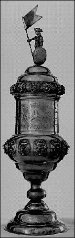 • Pokalformig med högt figurkrönt lock. På kuppans och lockets utsvängda nederpartier 12 stycken pålödda masker, vilka tjänstgjort som skylthållare. På kuppans cylindriska överdel inom en krönt bladkartusch bilden av en ovanifrån sedd trekantig hatt. På ömse sidor om denna två grupper av graverade namn. 1/Johan David Glasman, Joh:Aned Söderborg, Mathias Beckberg, Magnus Erlanson 2/ Ingell Lundberg, ... Visa hela