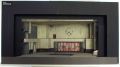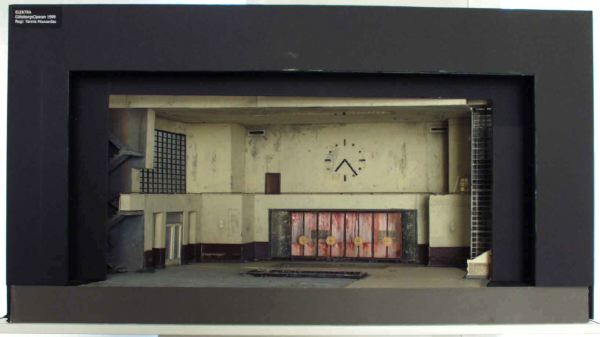 Tittskåpmodell utförd i svart med grå framkant på golvet, gråmelerat scengolv med två rektangulära rutor, varav den främre med öppning ner i scengolvet, på vänster sida finns en smal trappa i avsatser, på höger sida två breda trappor som delvis syns och är i profil, mellan dem finns en hiss som har hisstrumma av glasade väggar, i övrigt är väggarna gråvita, brun panel, vänster sida med glasfönster och dörröppning var sida av det, ovanför finns ett fönster efter hela sidan upp mot taket, en balkong löper efter hela väggen och bakgrundsväggen, mittväggen har fyra glasdörrar mot fondväggen bakom, som är rödstrimmig, ovanför glasdörrarna finns en stor urtavla med visare, taket över scenrummet har en infälld galleröppning.