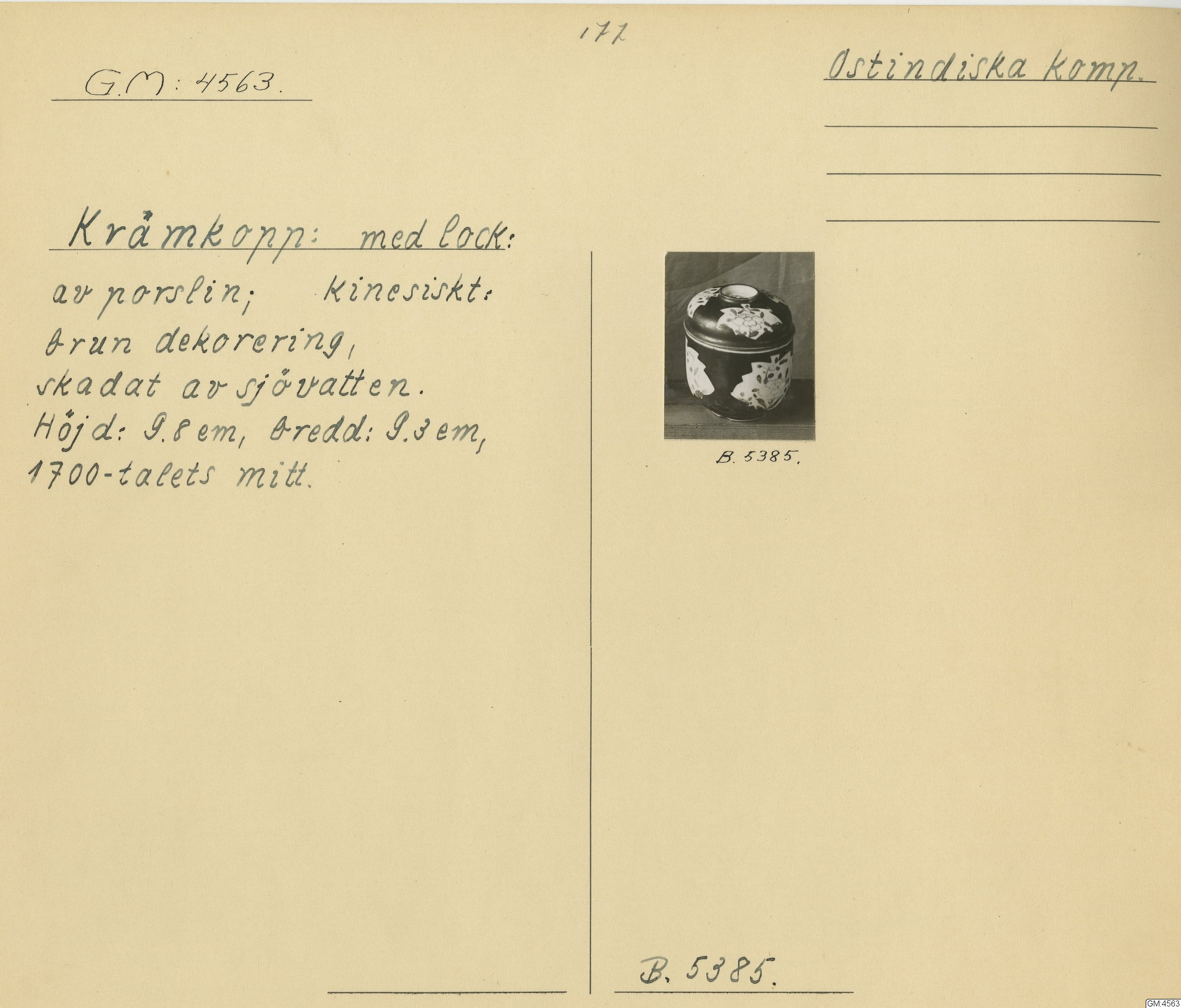 krämkopp Ostindiskt porslin, upptagen 1862 från sjöbotten utanför Älvsborgs fästning, 1700-tal. GM:4563