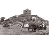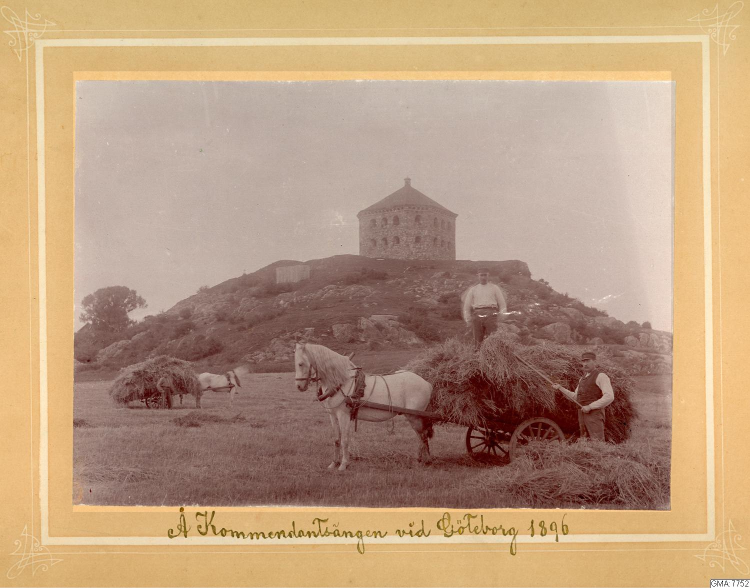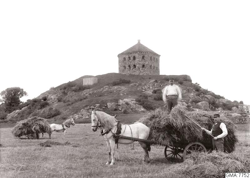 Höbärgning på Kommendantsängen, fotograferat söderifrån. I bakgrunden Skansen Kronan. Männen till höger är bröderna Viktor Larsson, till vänster på kärran, och åkare Oscar Larsson.