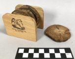 • Ställ med 6 tillhörande glasunderlägg. Föremålet är kopplat till varvet på Lindholmen.