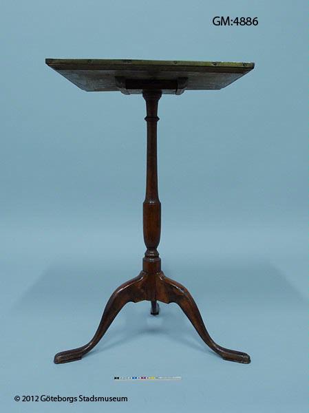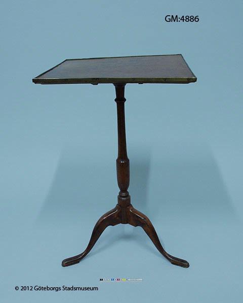 • Pelarbord med alrotsfanér och kantskoning av mässing. Blindträ av furu i skivan. Bordsskivan är fällbar; en rundstav från en kvadratisk avsats på pelaren ansluter med runstav till skivans underliggande gradlister. Pelaren är svarvad i björk som betsats och polerats. Tre fötter utförda i betsad björk och tappade till pelaren. Bordets ytor är schellackpolerade.