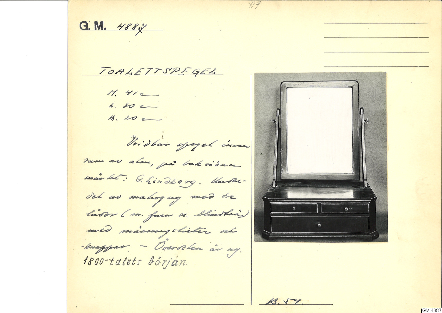 • Toalettspegel av mahogany och alm. Spegelns frånsida är signerad av mästare G. Lindberg samt stämpel troligen Stockholms hallstämpel.