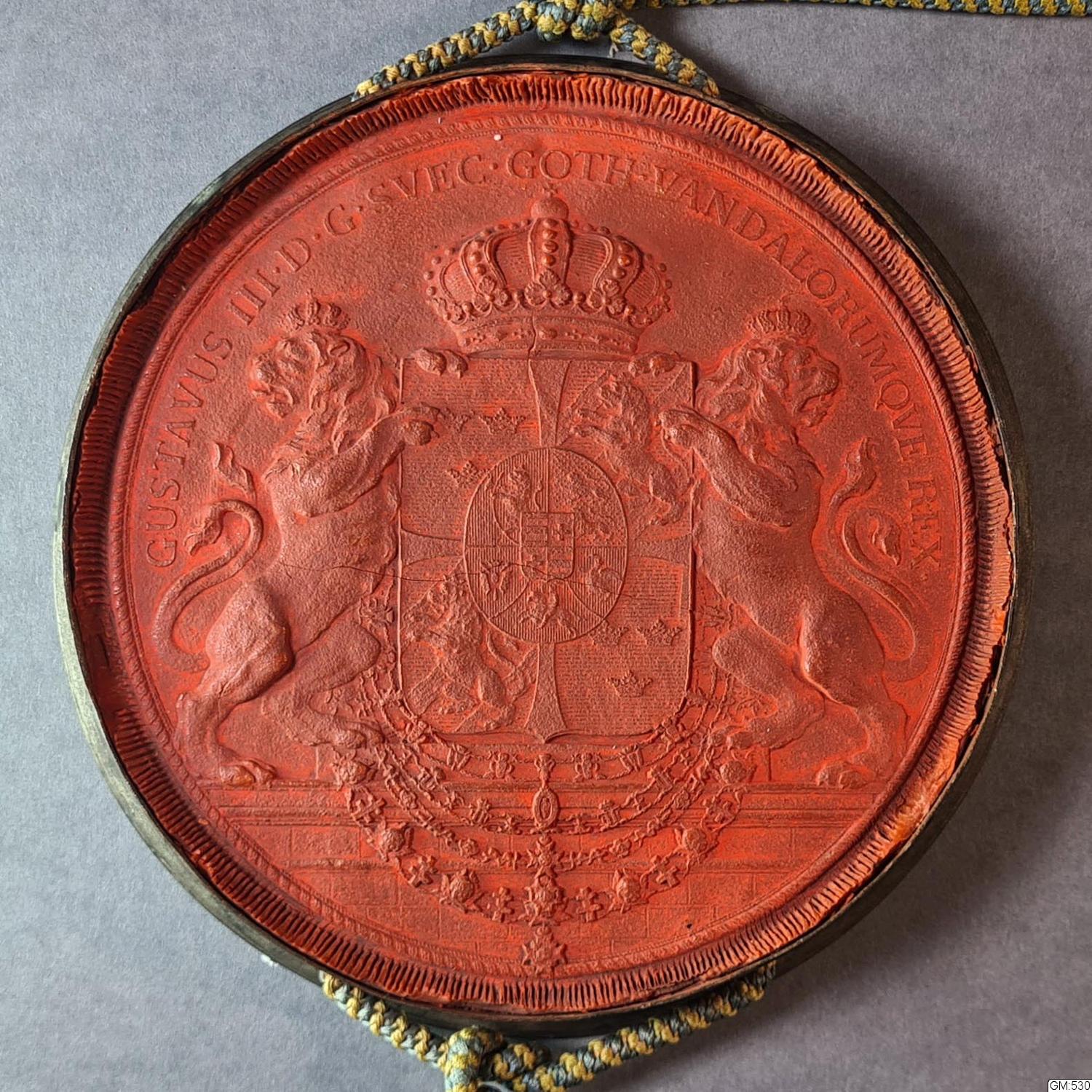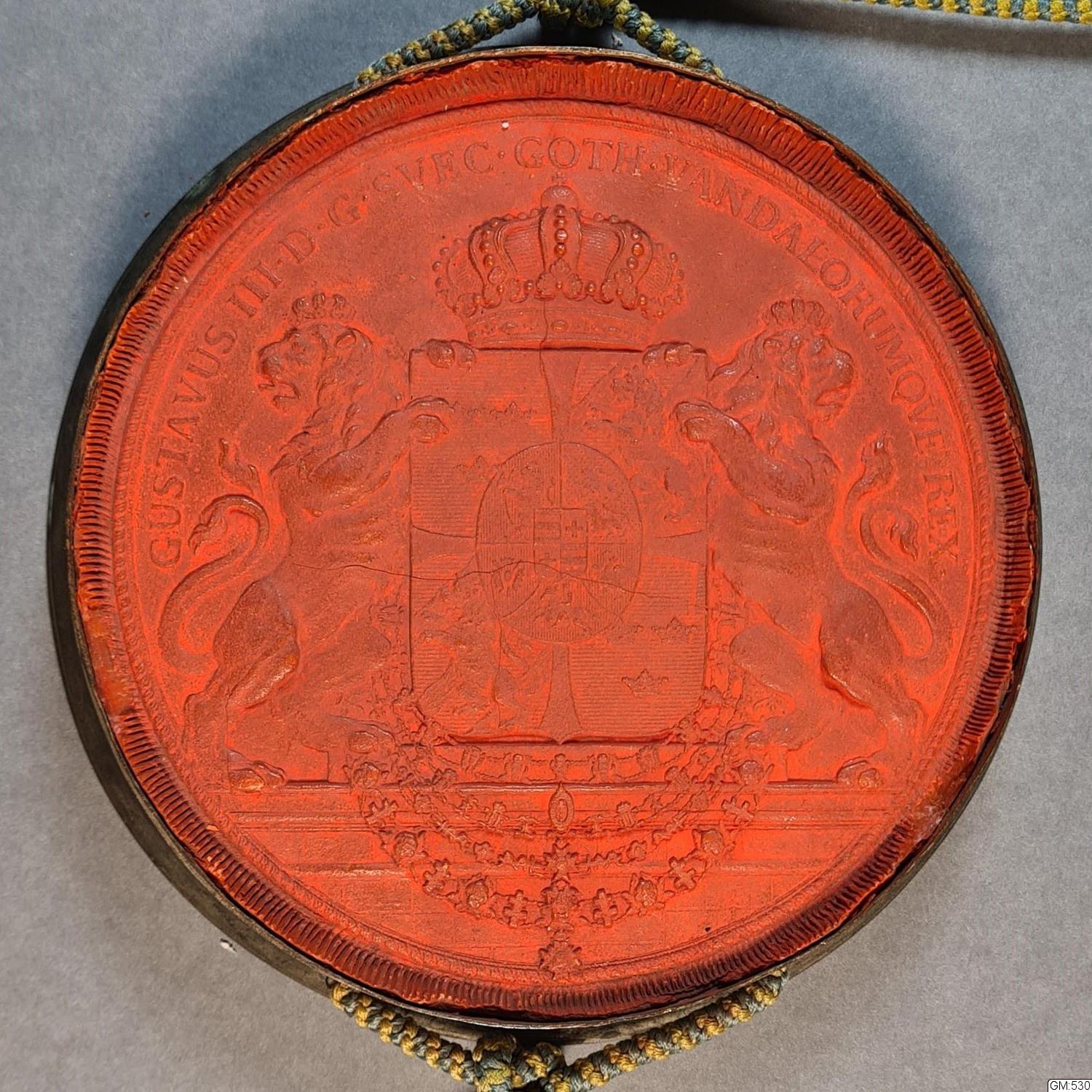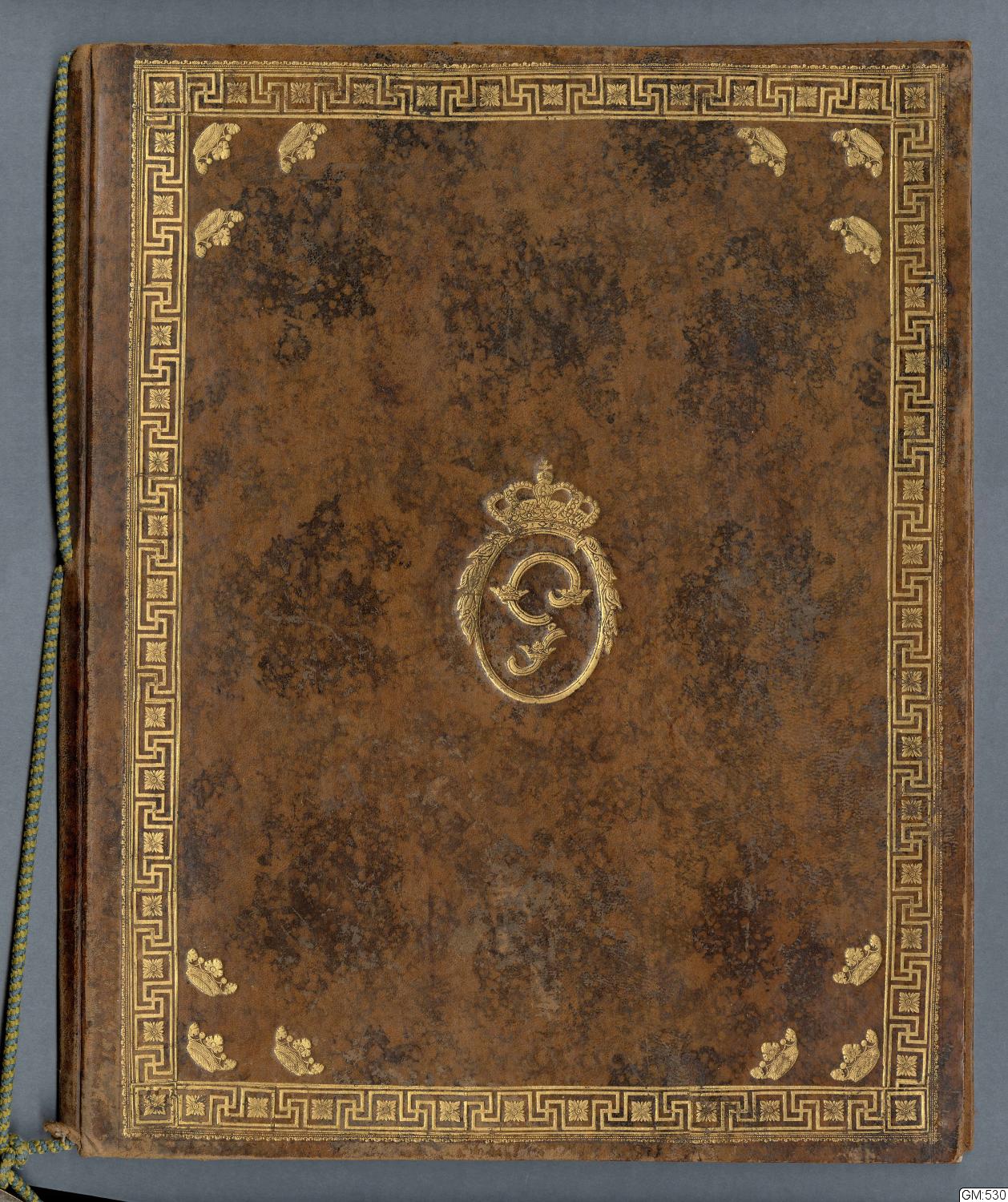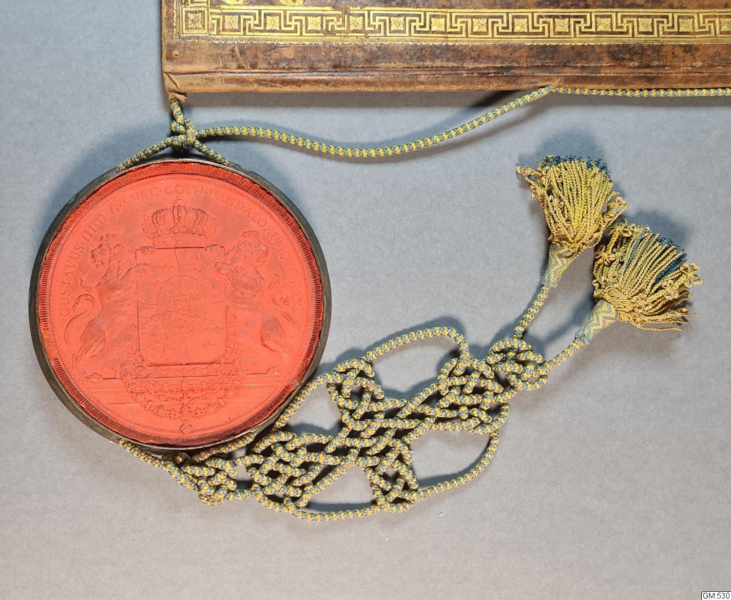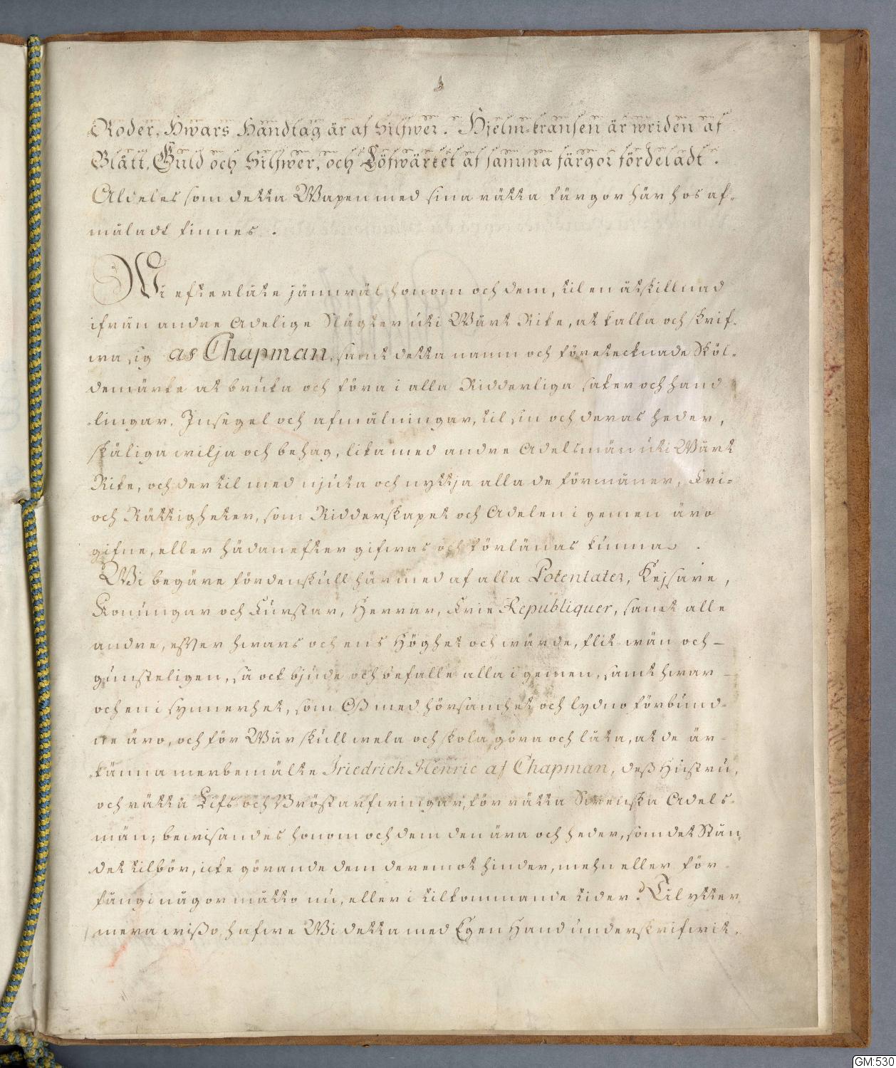 • Sköldebrev för Fredrik Henrik af Chapman, adlad 1772. Inbundet i brun läderpärm med präglad dekor i guld, 4 sidor. På sida 2 bild med familjevapnet. Med vidhängande rött sigill.