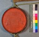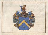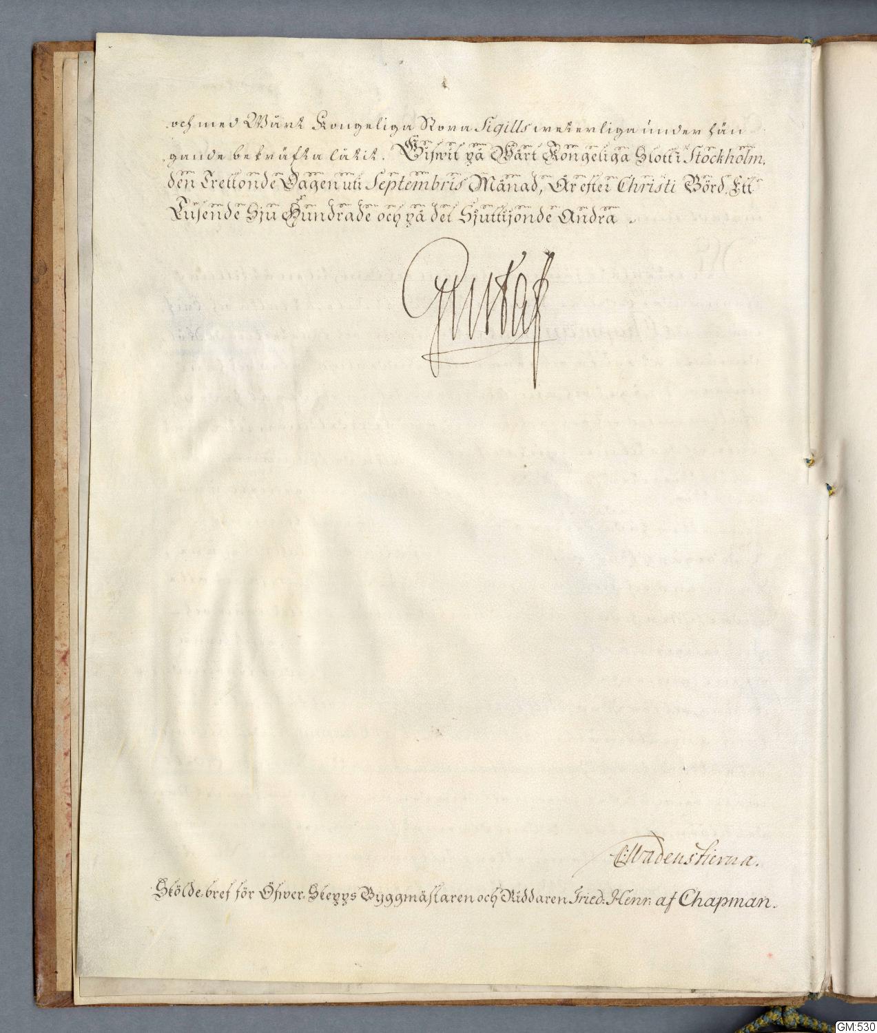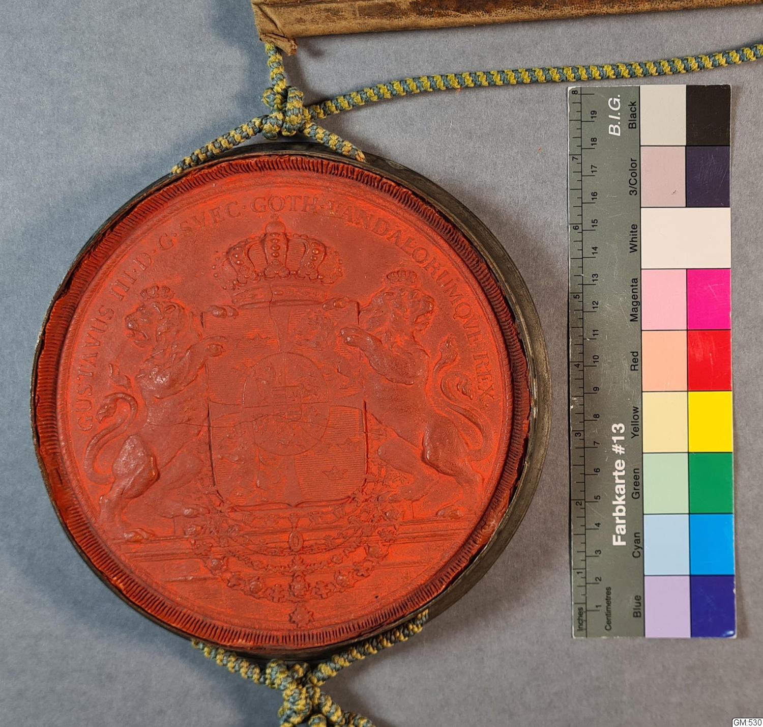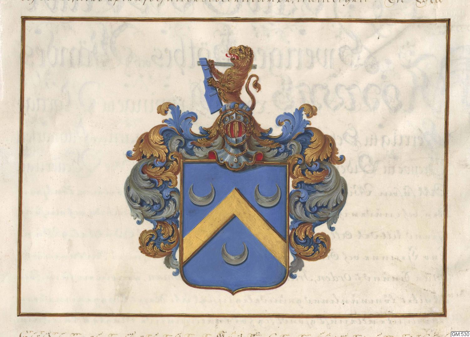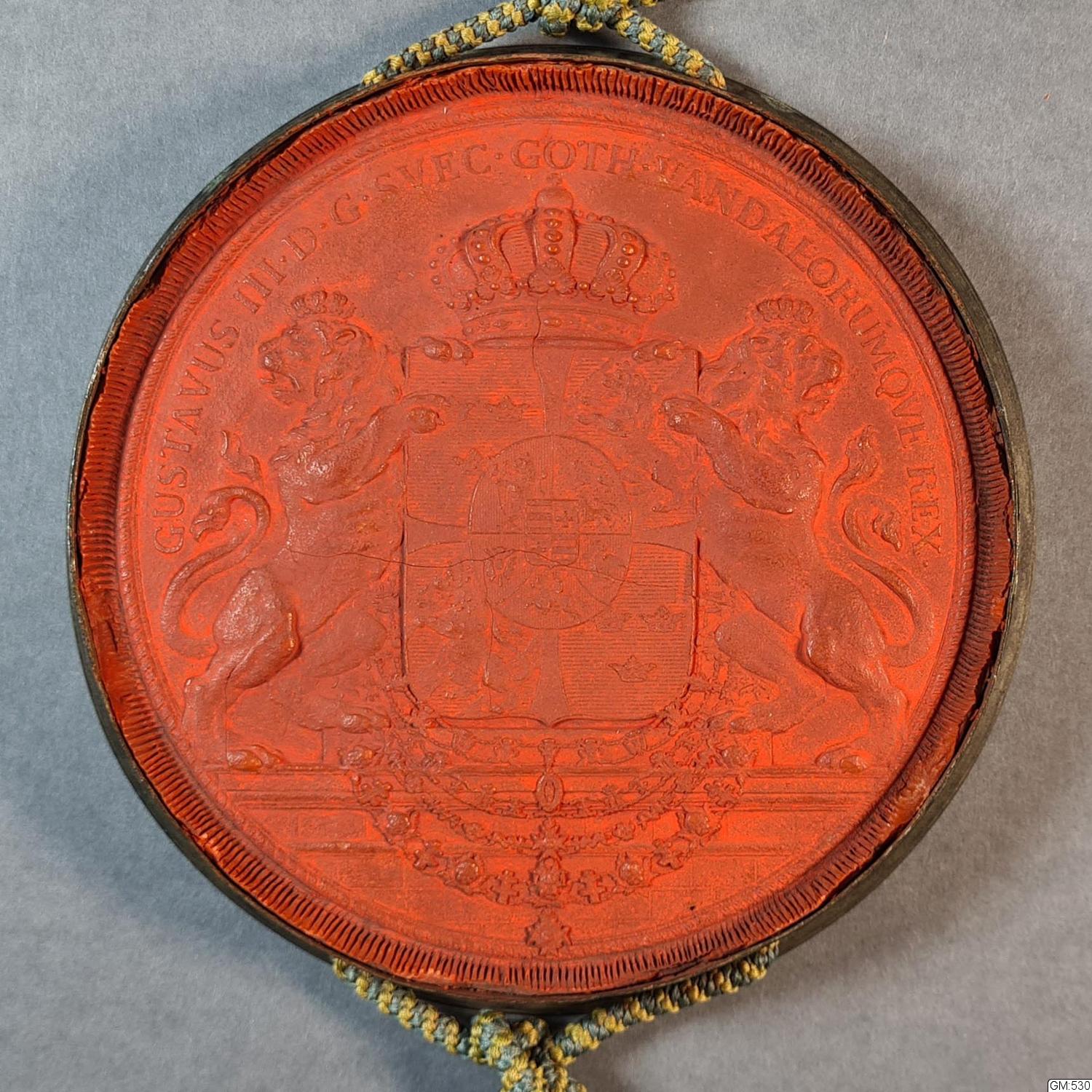 • Sköldebrev för Fredrik Henrik af Chapman, adlad 1772. Inbundet i brun läderpärm med präglad dekor i guld, 4 sidor. På sida 2 bild med familjevapnet. Med vidhängande rött sigill.