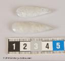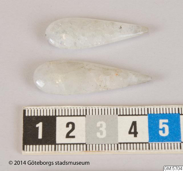 • "Kläppar, 2st till örhängen av vit sten. 1800-talets mitt. storlek:4,8x1,2cm" [Enligt katalogkort]