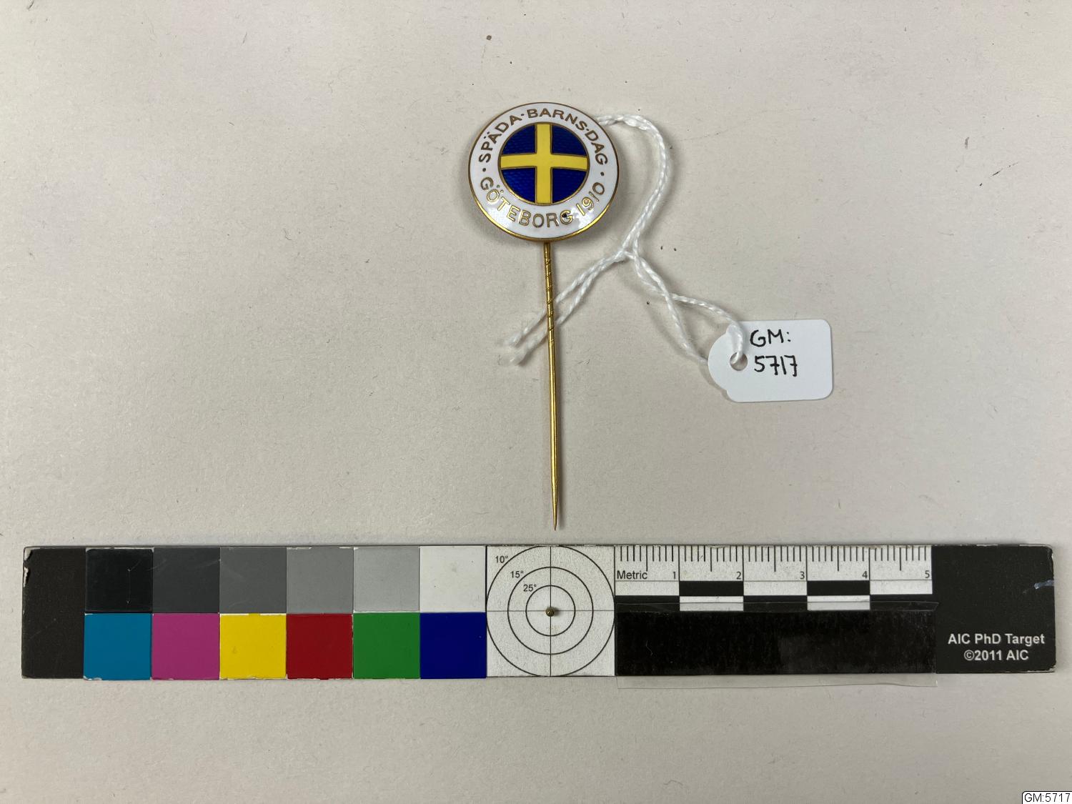 • En rund emaljerad nål med texten: "späda barnsdag Göteborg 1910"- runt kanten samt en svensk "flagga" i mitten.